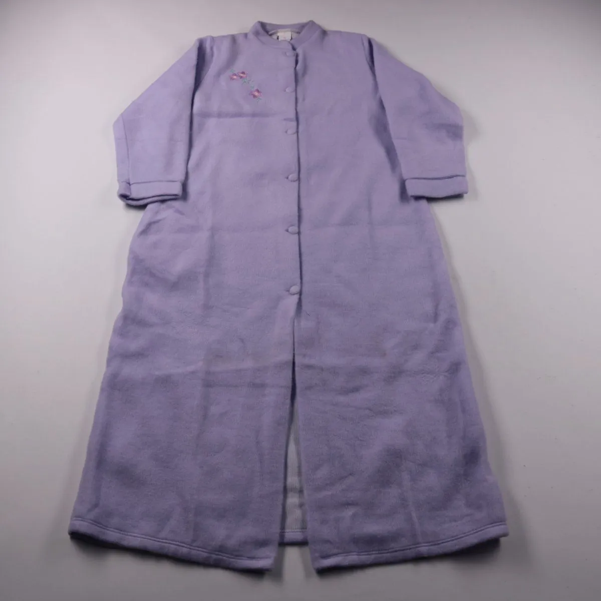 Домашний халат Courtelle лавандового цвета на пуговицах, с небольшим вышитым цветочным мотивом на груди. Подойдёт для дома и в качестве тёплой накидки после душа в прохладные дни. Мягкий акриловый материал неприхотлив в уходе и быстро сохнет.