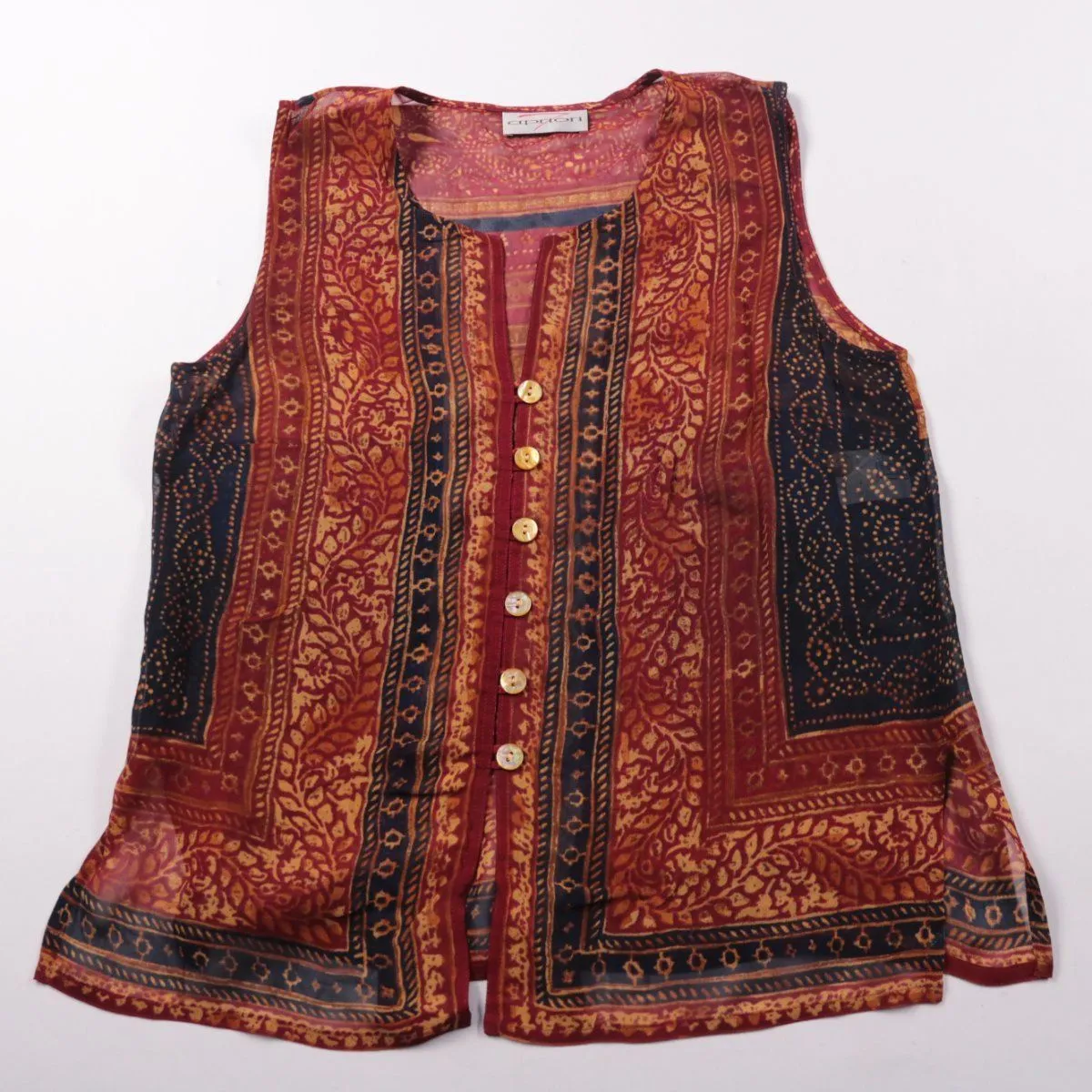 Женский жилет Apriori с этническим узором в бордово-сине-золотой гамме и застёжкой на пуговицы. Подойдёт для повседневных образов поверх топа, рубашки или водолазки в любое время года. Лёгкий и компактный, удобно брать с собой и быстро добавлять акцент в комплект.