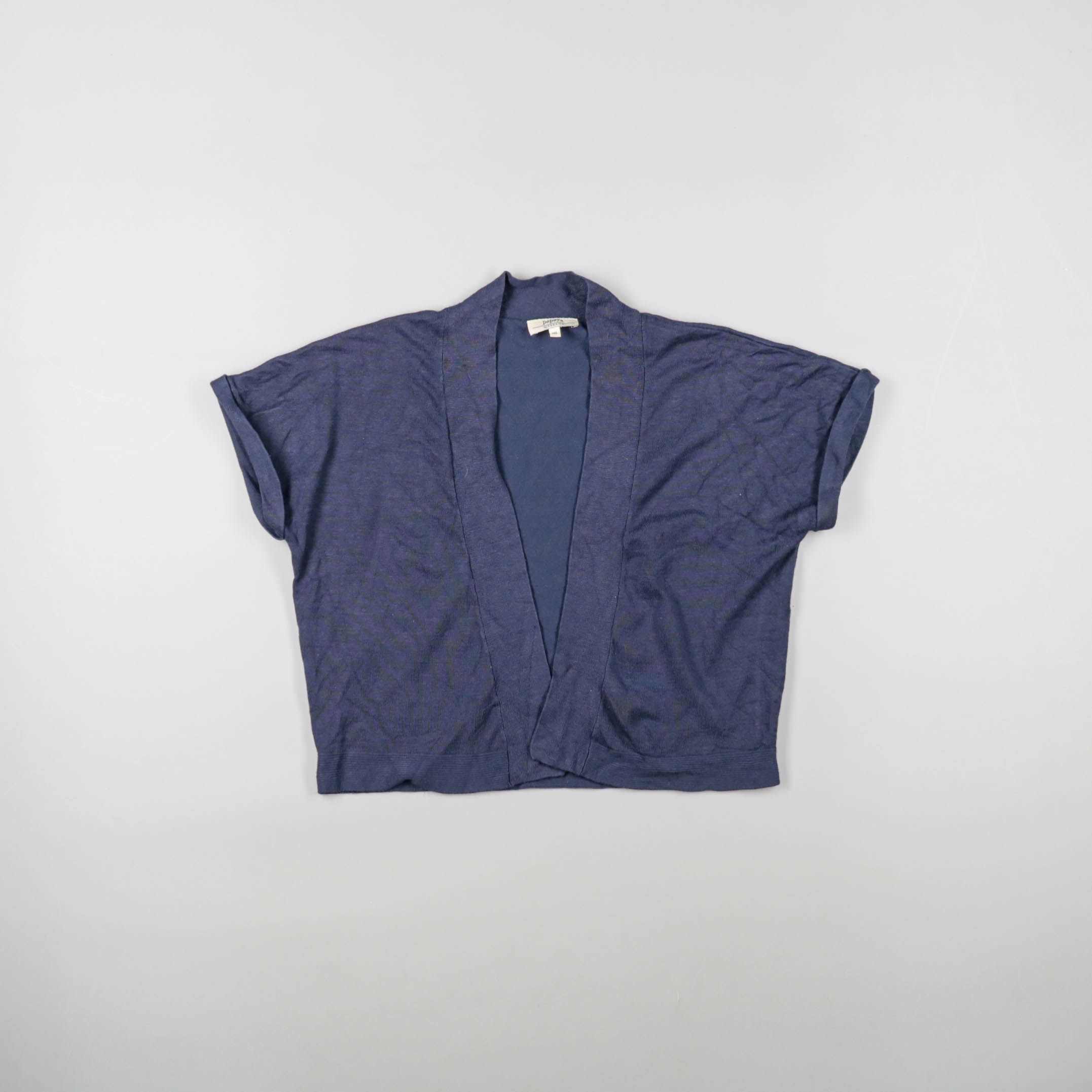 Женский укороченный кардиган без застёжки в тёмно-синем цвете. Лёгкий трикотаж с коротким рукавом подойдёт для офиса и повседневных образов, удобно накидывать поверх топа или платья. Практичный вариант для многослойности — не стесняет движений и легко ...