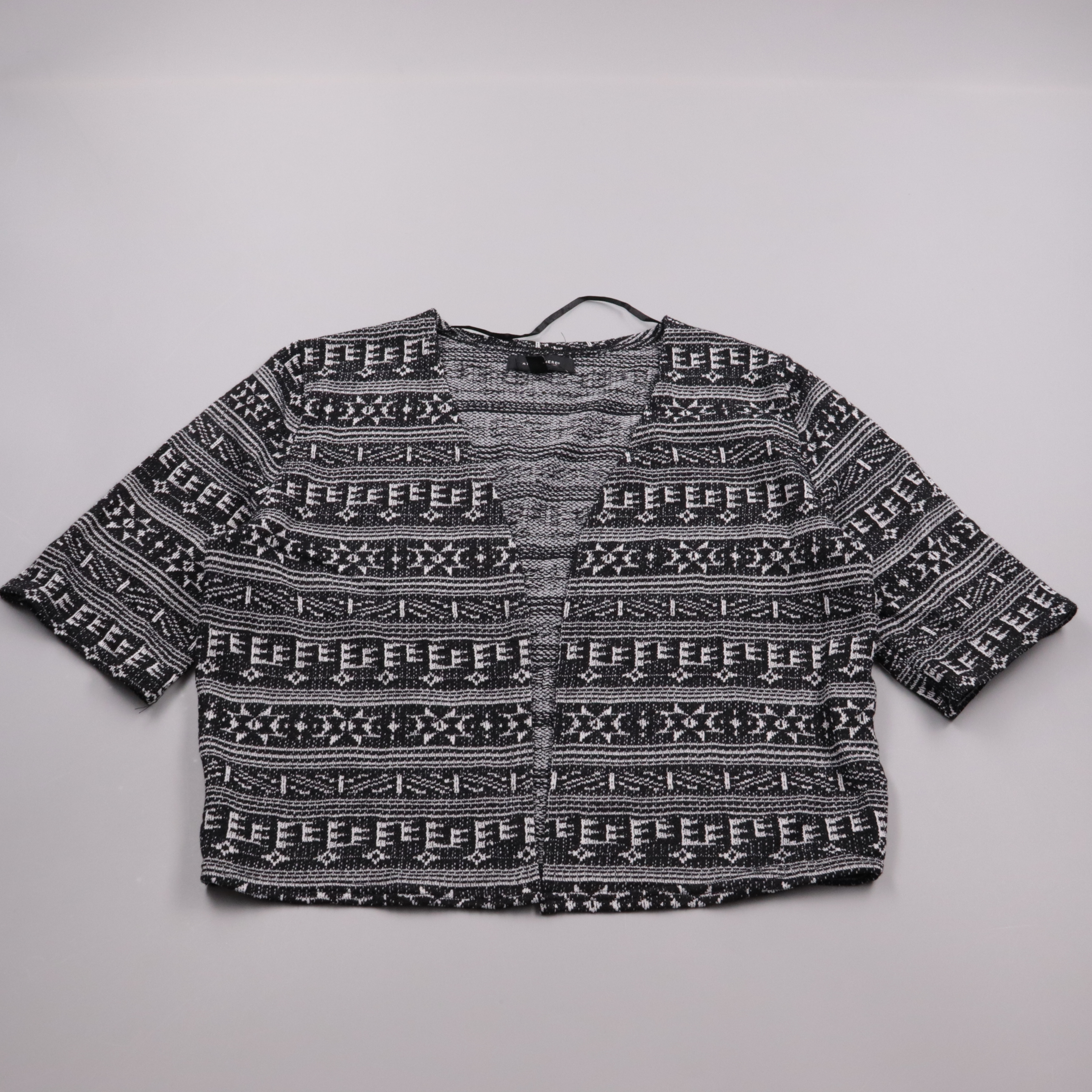 Укороченный кардиган Atmosphere в чёрно-белом жаккардовом узоре, без застёжки. Подойдёт для многослойных образов на прохладную погоду с джинсами, платьем или топом. Материал с добавлением эластана слегка тянется и комфортно садится по фигуре.