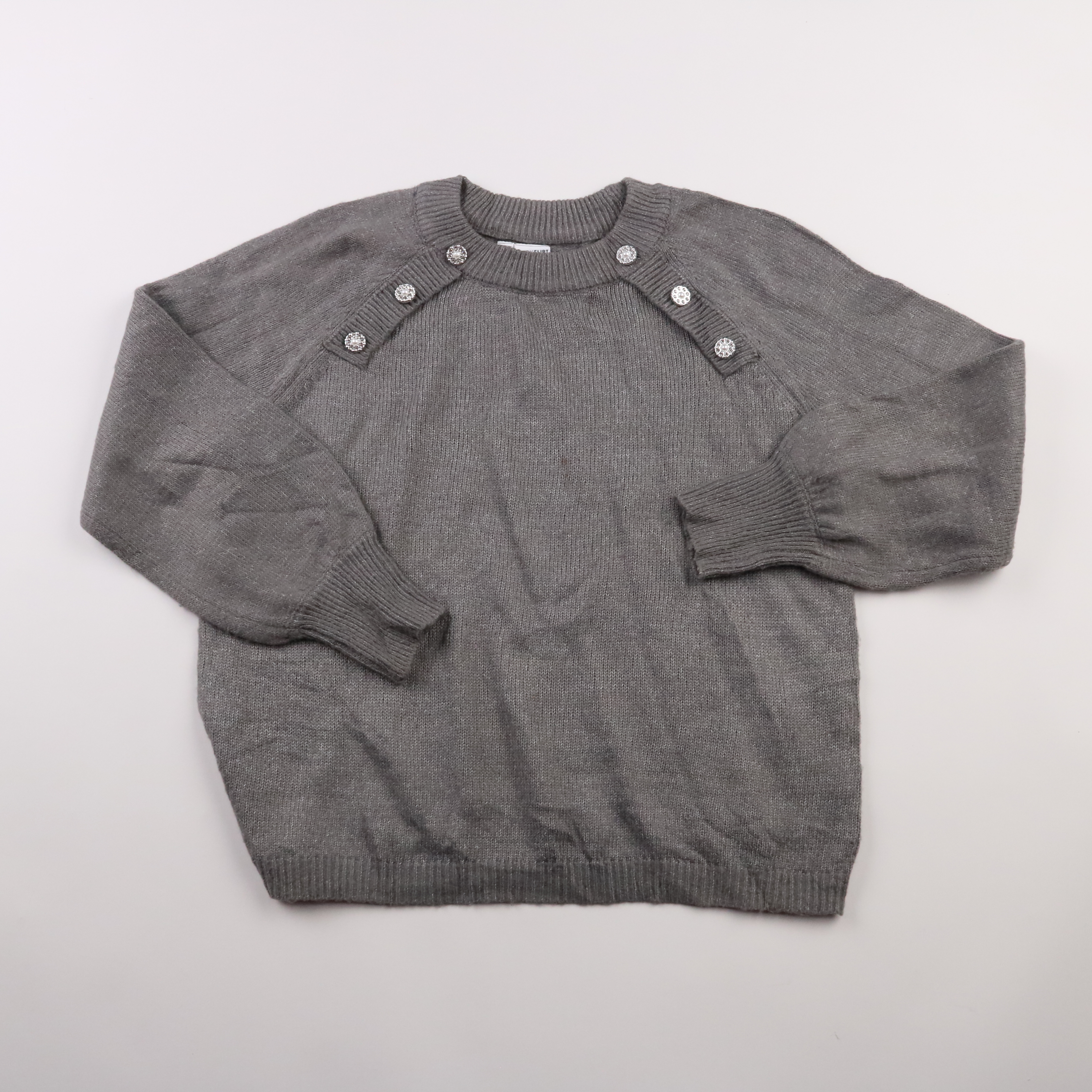 Серый джемпер Bodyflirt с круглым вырезом и декоративными пуговицами у горловины. Подойдёт для повседневных образов и офиса в прохладную погоду, легко сочетается с джинсами и юбками. Акриловый трикотаж практичен в уходе и быстро сохнет.