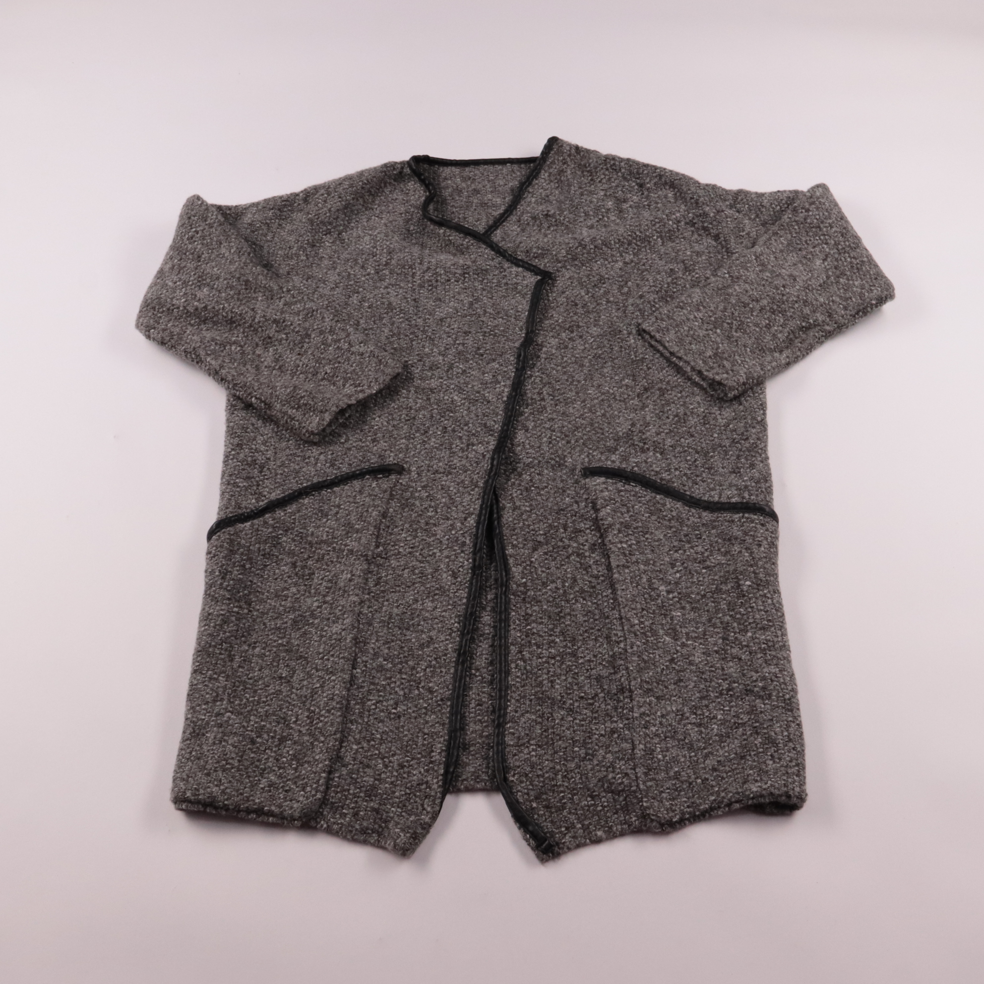 Серый кардиган без бренда из фактурного тёплого трикотажа с отделкой по краю и накладными карманами. Подойдёт для офиса и повседневных образов в прохладную погоду, хорошо смотрится поверх футболки или водолазки. Удобно носить как лёгкую верхнюю вещь бл...
