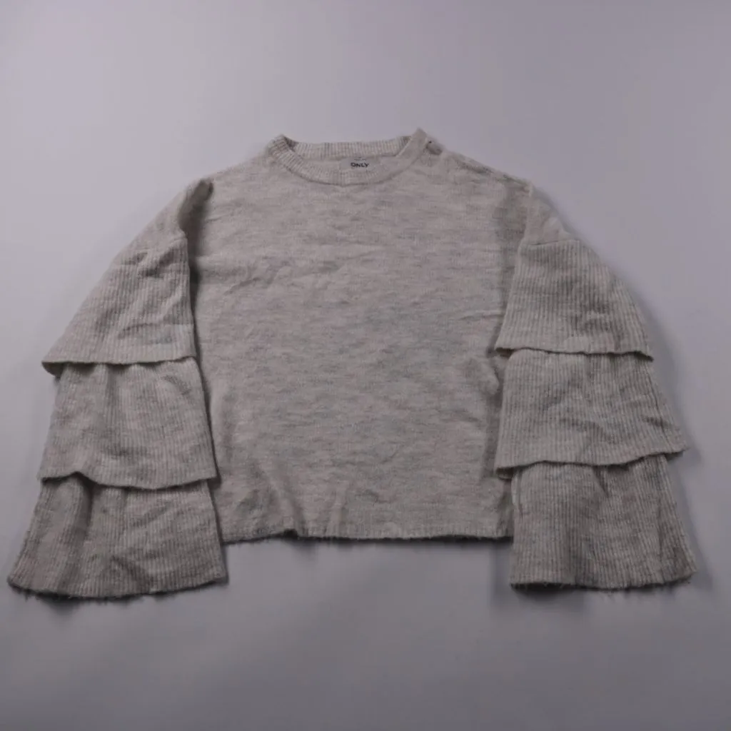 Женский джемпер ONLY светло-серого меланжа с круглым вырезом и многослойными рукавами-воланами. Подойдёт для прохладной погоды и образов в стиле casual, хорошо сочетается с джинсами и юбками. Трикотаж эластичный, комфортно садится по фигуре.
