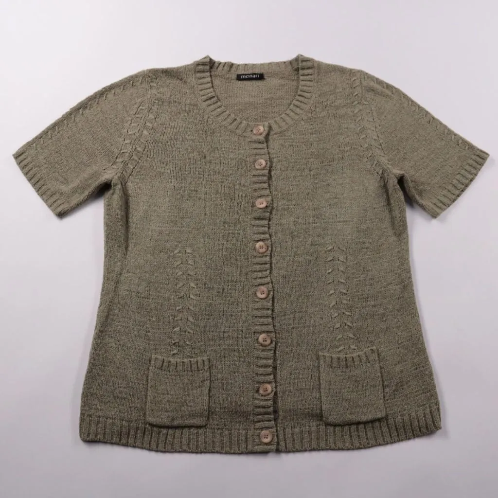 Вязаный кардиган Monari цвета хаки с коротким рукавом, застёжкой на пуговицы и накладными карманами. Подойдёт для повседневных образов и как лёгкий верхний слой в прохладные дни. Практичен тем, что легко комбинируется с базовыми вещами и не занимает мн...