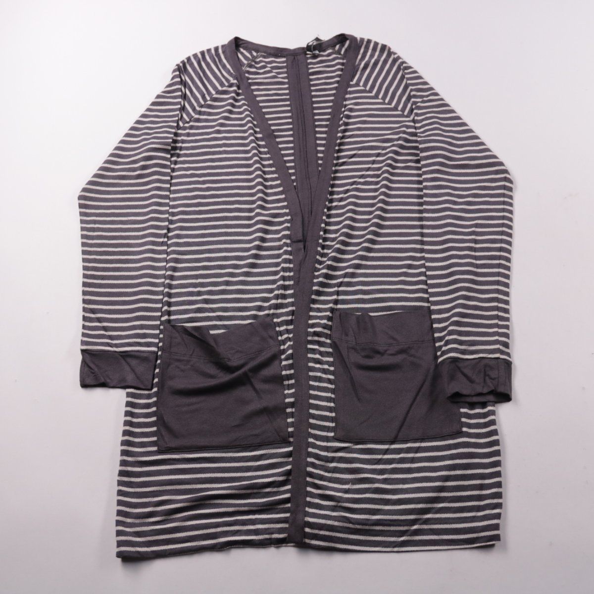 Кардиган Myrine в серо-белую полоску, удлинённый, с открытым передом и накладными карманами. Подойдёт для повседневных образов и как второй слой в прохладную погоду. Практичное преимущество — удобные карманы и лёгкость в сочетании с базовыми вещами.