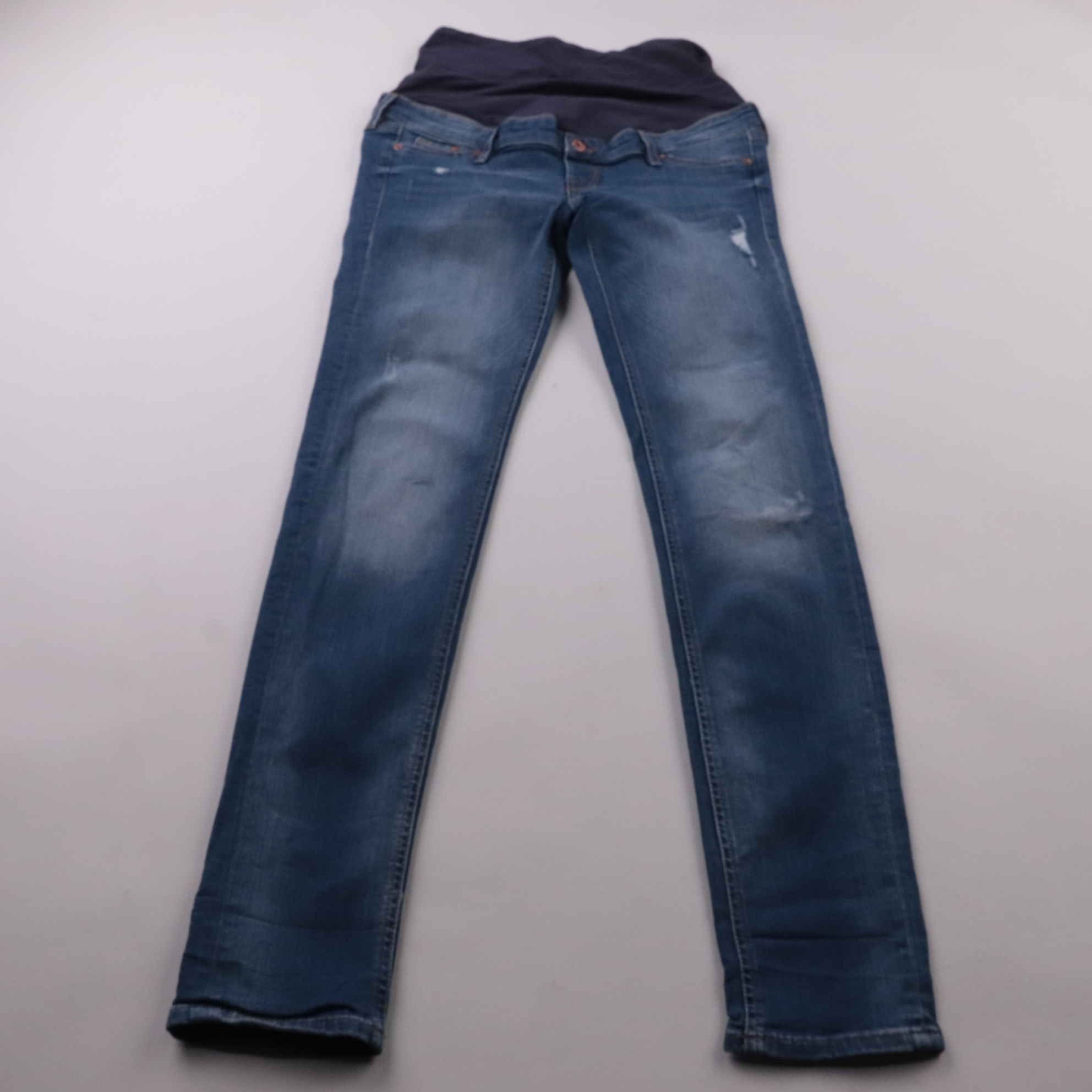Женские джинсы H&M Mama Skinny High Rib в синем дениме с высокой эластичной вставкой на поясе. Подойдут на каждый день и для периода беременности, хорошо сочетаются с футболками и свитшотами. Ткань со стрейчем комфортно тянется и не сковывает движения.