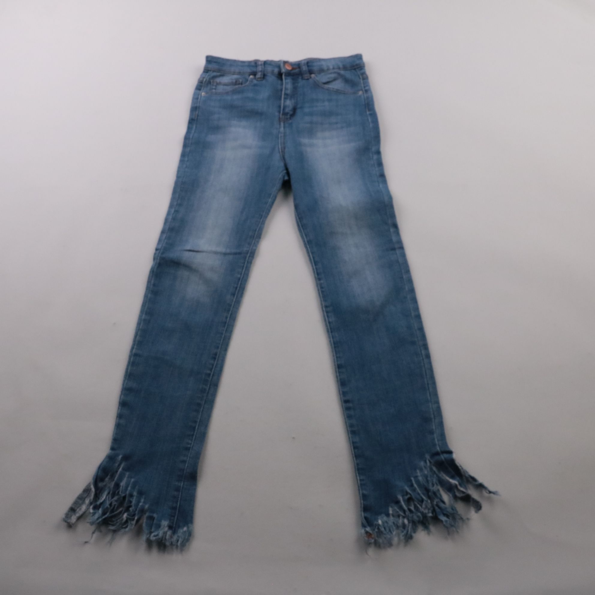 Женские джинсы из денима голубого цвета с эффектом легкой варки и необработанным бахромчатым низом. Подойдут для повседневных образов с кедами или ботинками в любое время года. Плотная джинса хорошо держит форму и не требует сложного ухода.