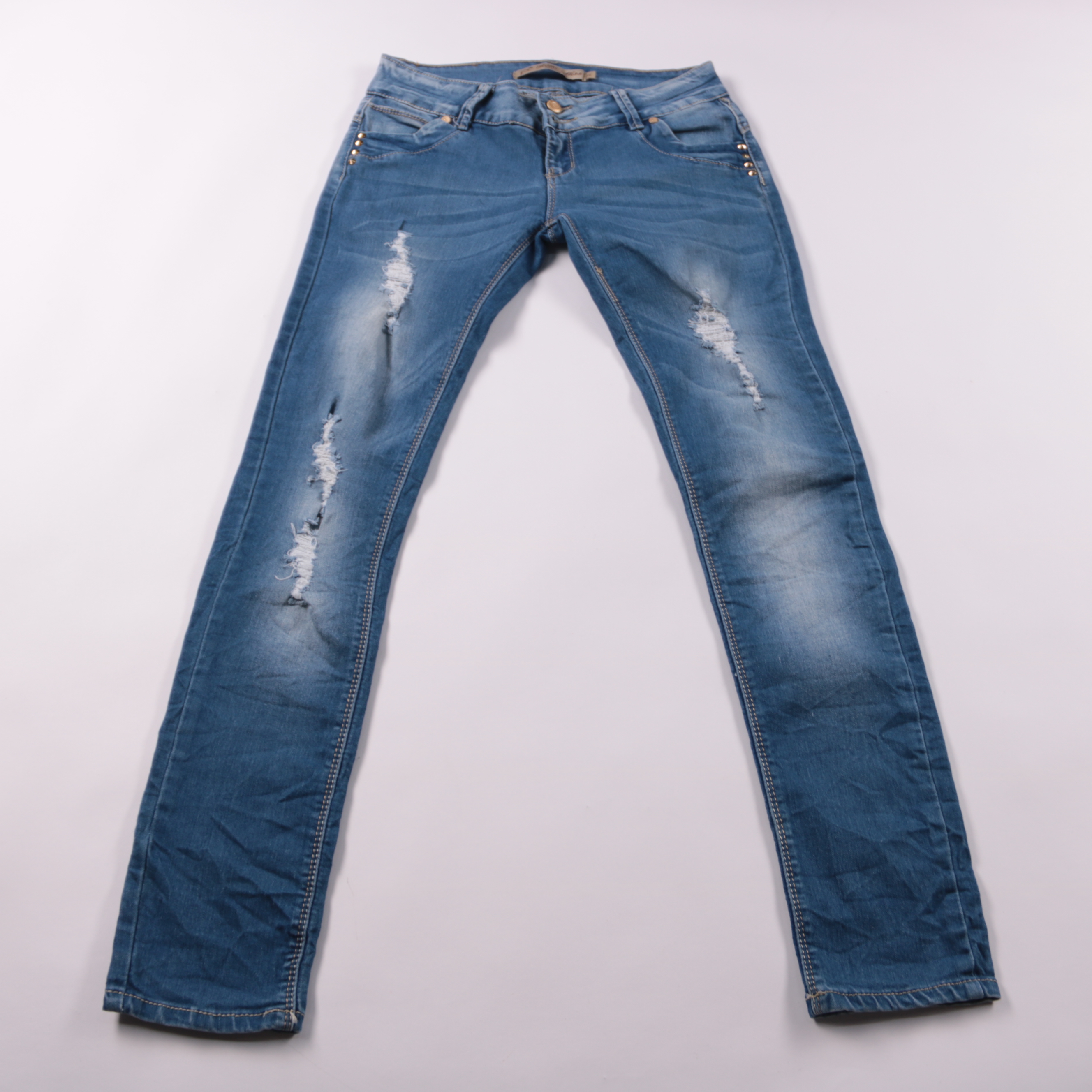 Женские джинсы Kella Miss из синего денима с эффектом потертостей и декоративными заклёпками у карманов. Подойдут для повседневных образов с футболками и свитшотами в любое время года. Ткань со спандексом немного тянется и комфортно садится по фигуре.