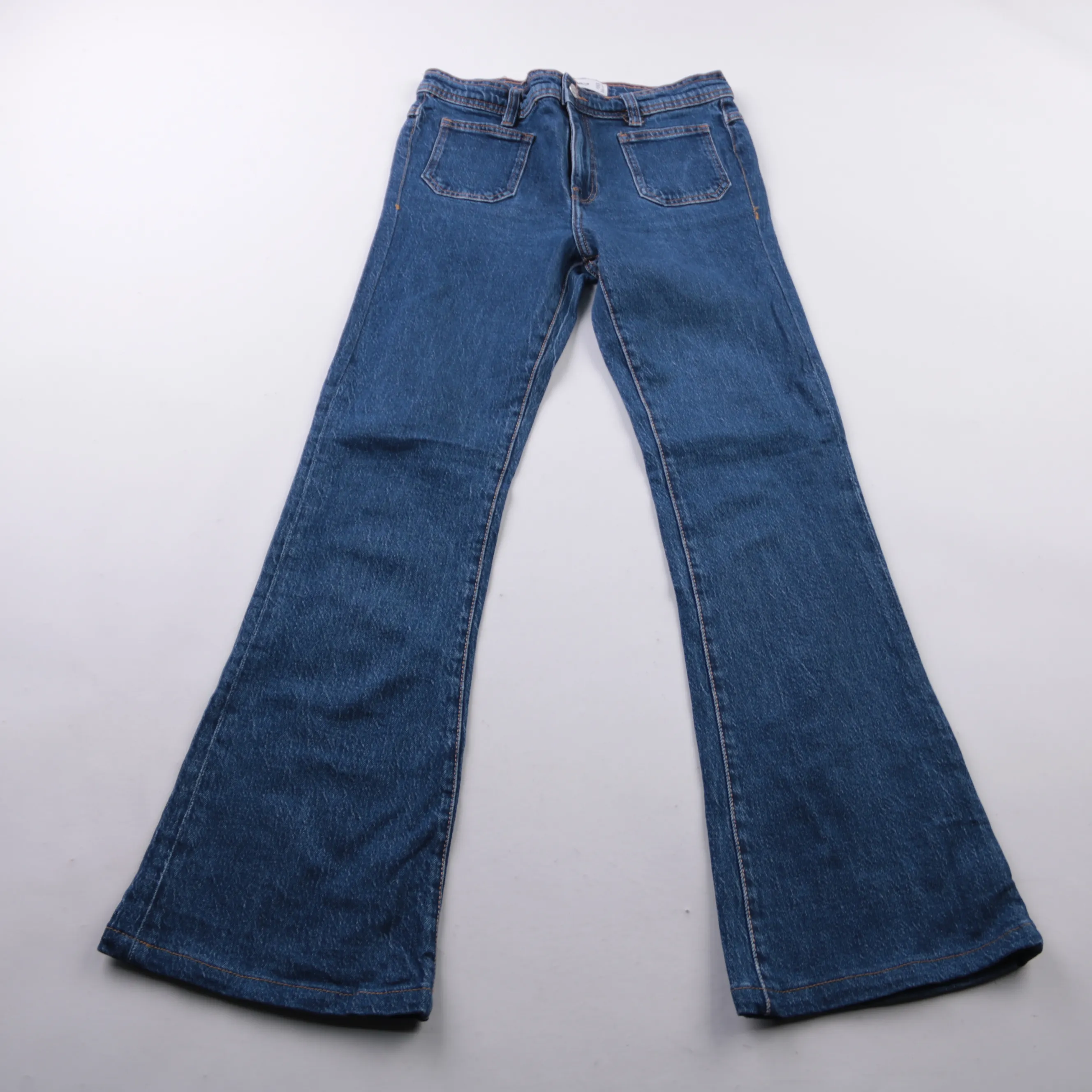Женские джинсы Mango Denim синего цвета с расклешёнными штанинами. Подойдут для повседневных образов и сочетаний с обувью на каблуке или платформе. Плотный деним хорошо держит форму и практичен в носке.