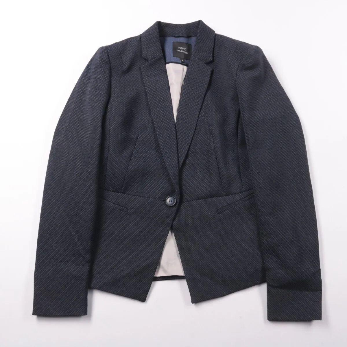 Женский пиджак Next Tailoring тёмно-синего цвета с фактурной тканью и застёжкой на одну пуговицу. Подойдёт для офиса и деловых встреч, легко сочетается с брюками, юбкой или платьем. Есть подкладка, благодаря чему пиджак комфортно сидит и держит форму.