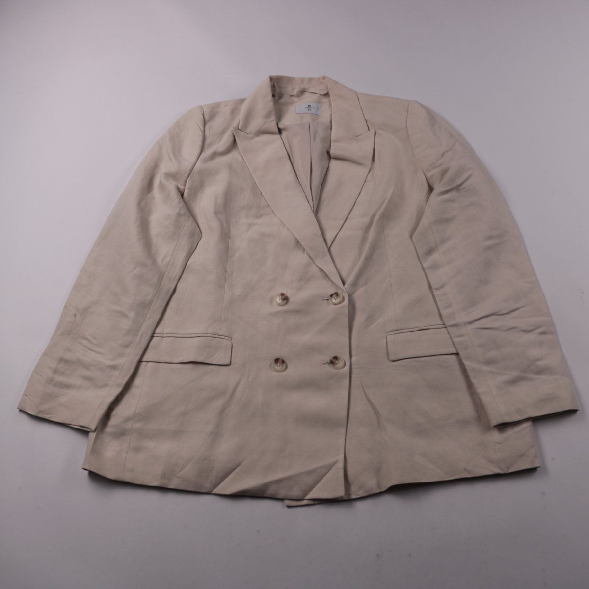 Двубортный женский пиджак Woman в бежевом цвете с отложным воротником и клапанами карманов. Подойдёт для офиса и повседневных образов в тёплый сезон. Ткань с льном в составе лучше дышит и комфортнее в носке.