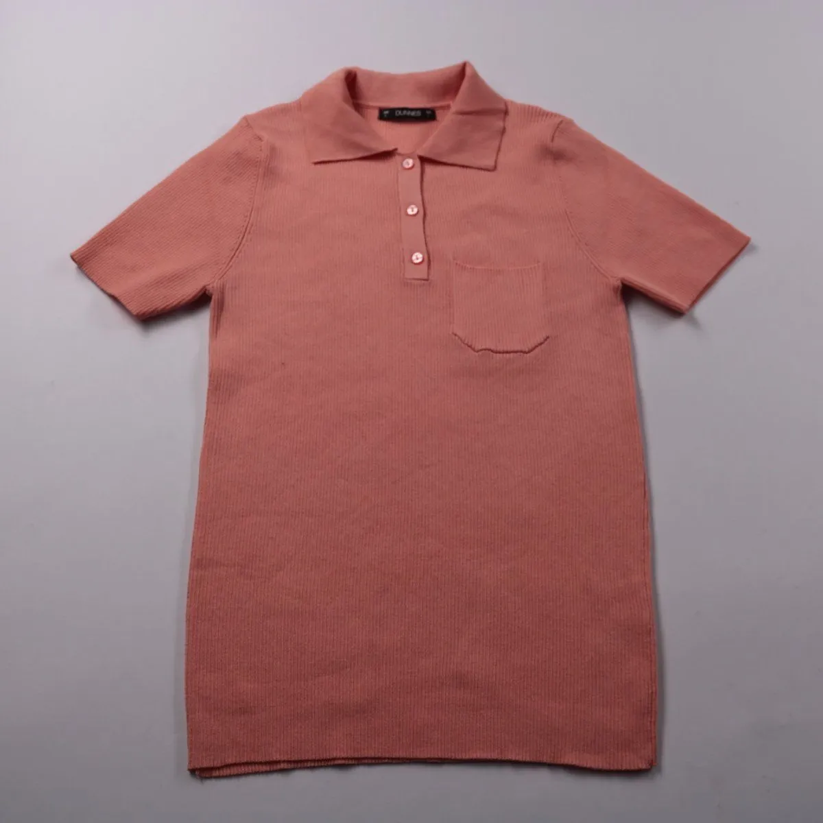 Трикотажное платье-поло Dunnes кораллового цвета в рубчик, с коротким рукавом, пуговицами и нагрудным карманом. Подойдёт для повседневных летних образов и поездок, хорошо сочетается с кедами или сандалиями. Эластичный материал комфортно садится по фигуре и почти не мнётся в носке.