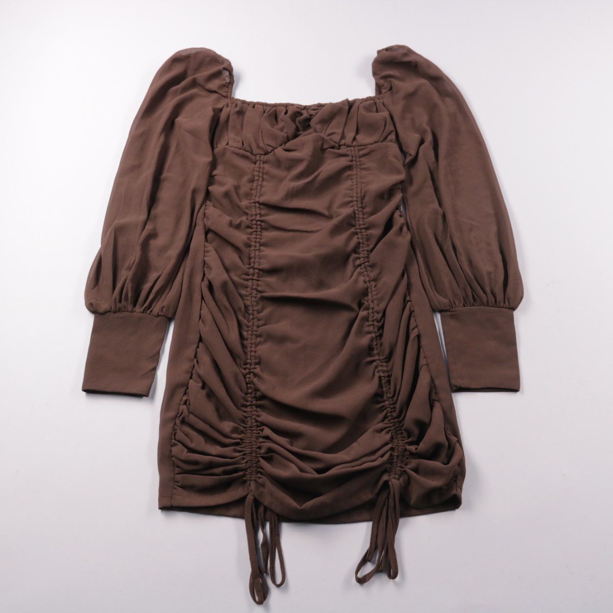 Платье PrettyLittleThing шоколадного цвета с драпировкой и кулисками по бокам, а также рукавами-фонариками. Подойдёт для вечеринок и выходов, легко регулируется по длине и посадке за счёт утяжек. Полиэстеровый материал практичен в уходе и быстро сохнет.