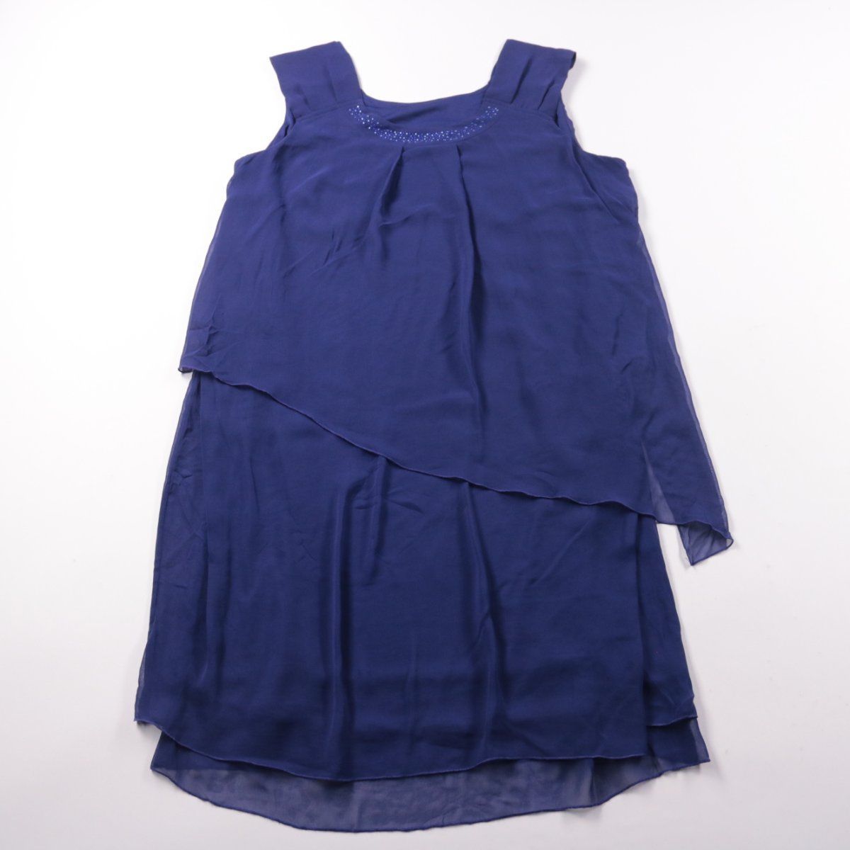 Летнее платье без рукавов из лёгкой полупрозрачной ткани синего цвета, с многослойным асимметричным подолом и небольшим декором у выреза. Подойдёт для повседневных прогулок и отдыха в тёплую погоду. Свободный крой не сковывает движения и хорошо проветривается.