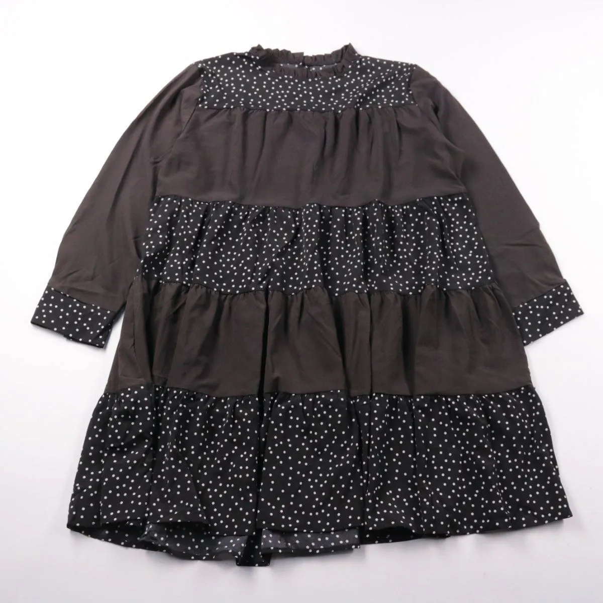Повседневное платье Shein чёрного цвета с вставками в белый горошек и ярусной юбкой, длинный рукав. Подойдёт для прогулок и на каждый день в прохладную погоду, можно носить с ботинками или кроссовками. Свободный крой не стесняет движения и комфортно садится по фигуре.
