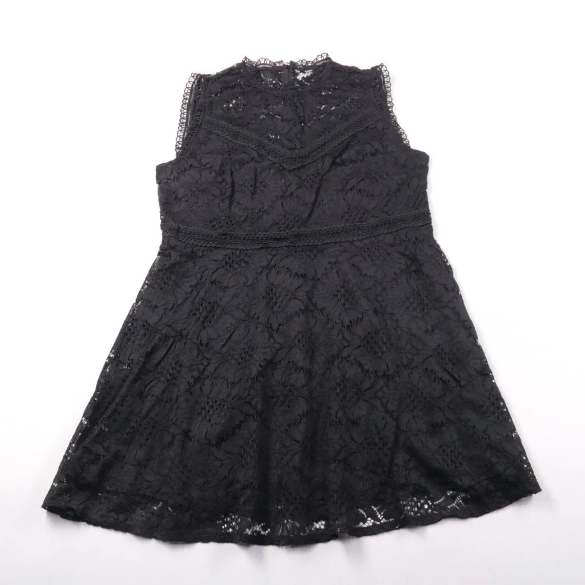 Черное кружевное платье без бренда с высоким воротом и приталенной линией талии. Подойдет для вечерних выходов и мероприятий, хорошо смотрится с каблуками и лаконичными аксессуарами. Кружевная фактура делает образ выразительным без лишнего декора.