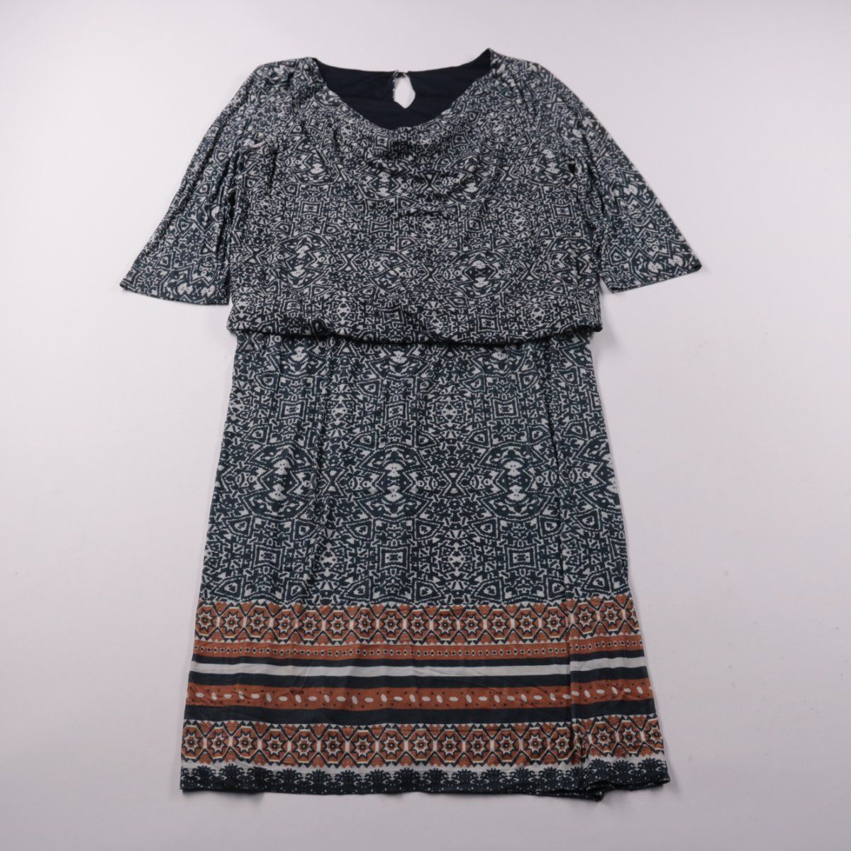 Повседневное платье с этническим принтом и короткими рукавами, с небольшим вырезом-каплей сзади. Подойдёт для прогулок и повседневной носки в тёплую погоду. Тонкий материал почти не мнётся и удобно берётся с собой в поездки.