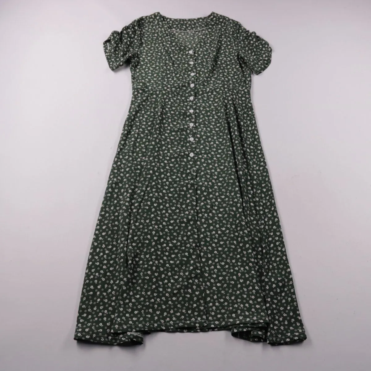 Повседневное платье Shein тёмно-зелёного цвета с мелким белым цветочным принтом и застёжкой на пуговицы спереди. Подойдёт для прогулок и на каждый день в тёплую погоду, короткие рукава с лёгкой сборкой. Практично тем, что ткань почти не мнётся и за изделием легко ухаживать.
