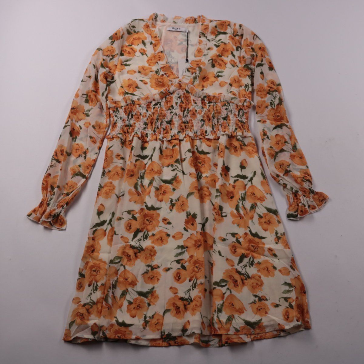 Повседневное мини-платье NA-KD с V-образным вырезом и цветочным принтом, с присборенной (smock) вставкой на талии и длинными рукавами. Подойдёт для летних прогулок и неформальных встреч, ткань лёгкая и воздушная. Практичный плюс — эластичная талия удобно садится по фигуре.