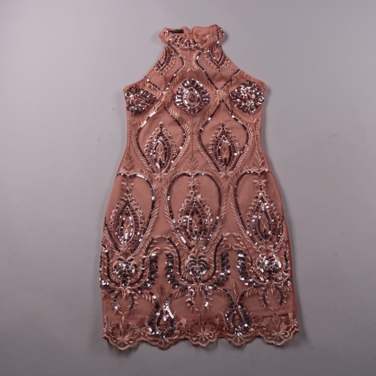 Вечернее платье Quiz пудрово-розового цвета с вышивкой и пайетками, приталенного силуэта и с высоким воротом. Подойдёт для вечеринки, выпускного или торжественного ужина, хорошо смотрится с лаконичными туфлями и клатчем. Подкладка делает посадку комфортнее и помогает платью держать форму.
