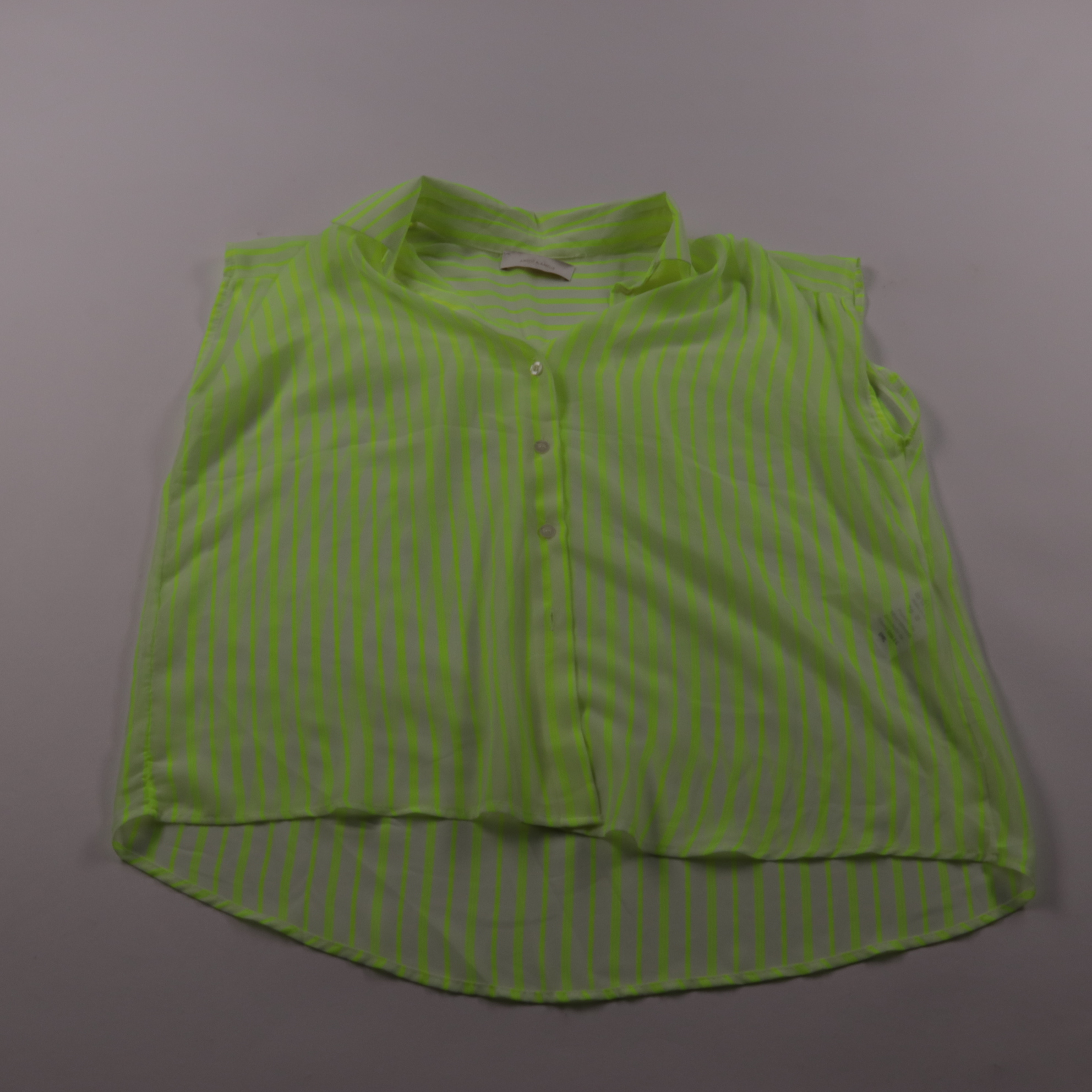 Лёгкая женская блузка Amélie&Amélie в бело-салатовую полоску, без рукавов и с воротником-стойкой. Подойдёт для лета и тёплой погоды, удобно сочетать с джинсами, шортами или юбкой. Практична тем, что тонкая ткань быстро сохнет и почти не утяжеляет образ.