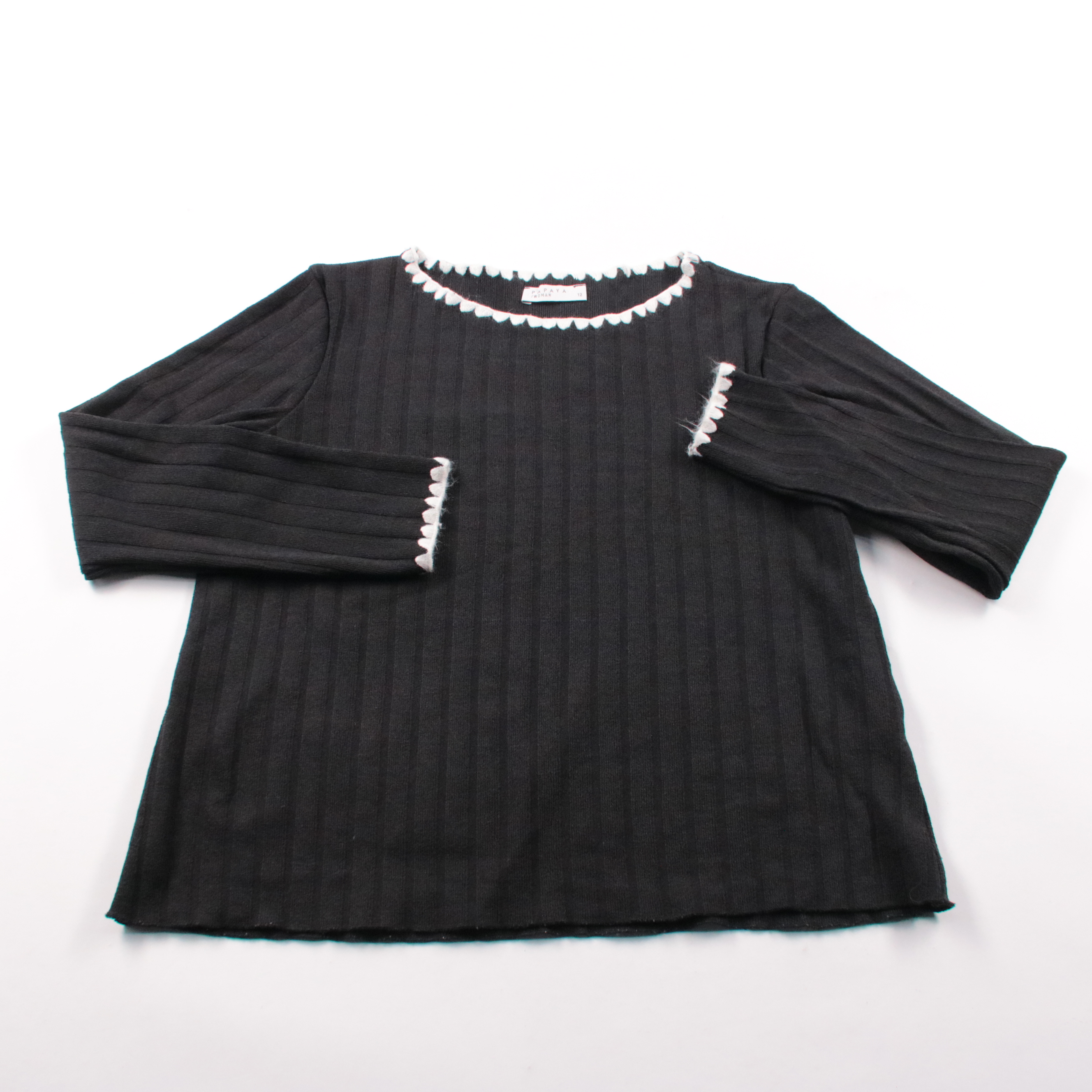 Женская блузка Papaya из чёрного ребристого трикотажа с белой декоративной окантовкой по вырезу и манжетам. Подойдёт для повседневных образов и офиса с жакетом или кардиганом. Ткань тянется и комфортно садится по фигуре, не сковывает движения.