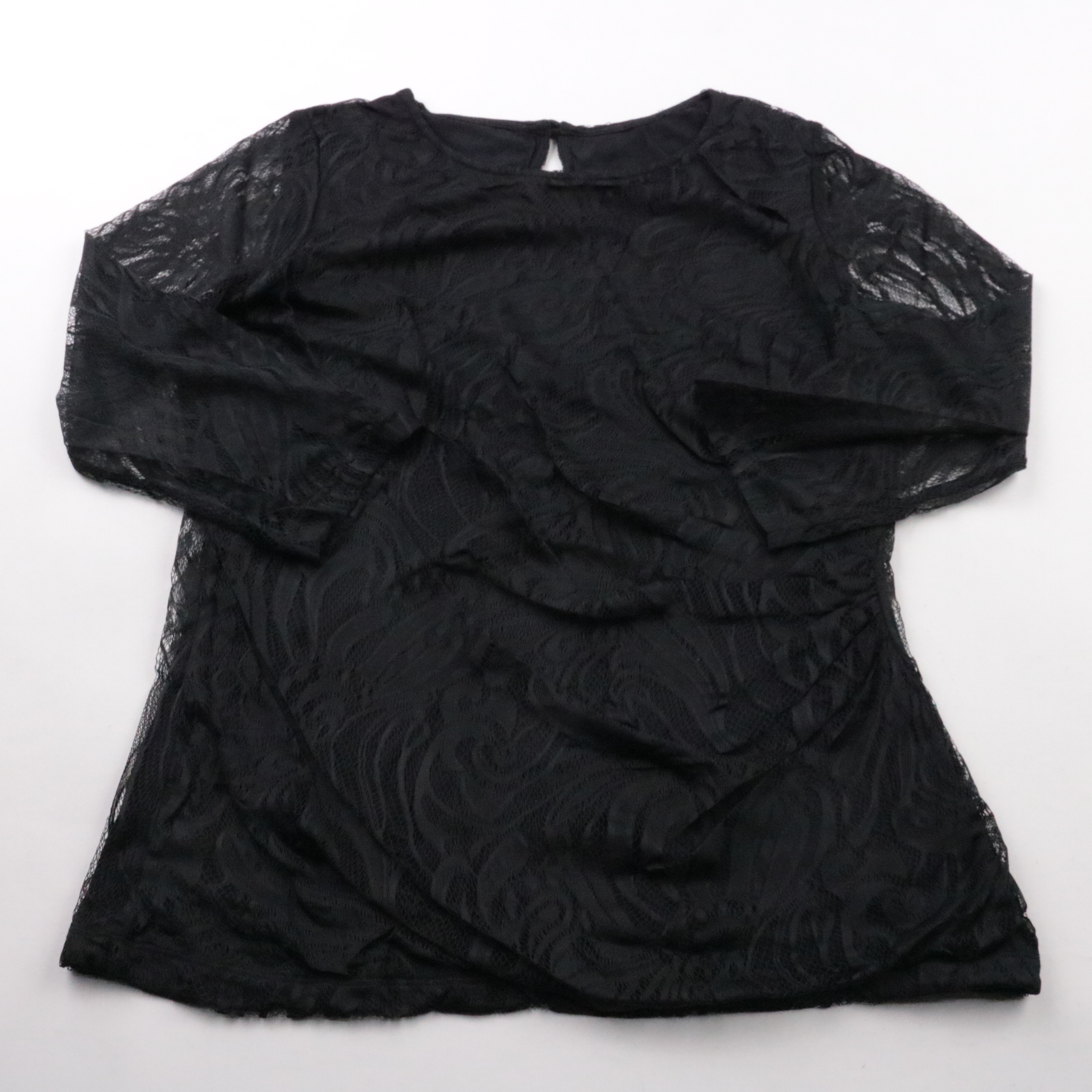 Чёрная блузка из фактурной полупрозрачной ткани с узором и длинными рукавами. Подойдёт для вечерних выходов или как нарядный слой поверх топа, на спинке есть вырез-капля. Лёгкий материал почти не мнётся и удобно смотрится в многослойных образах.