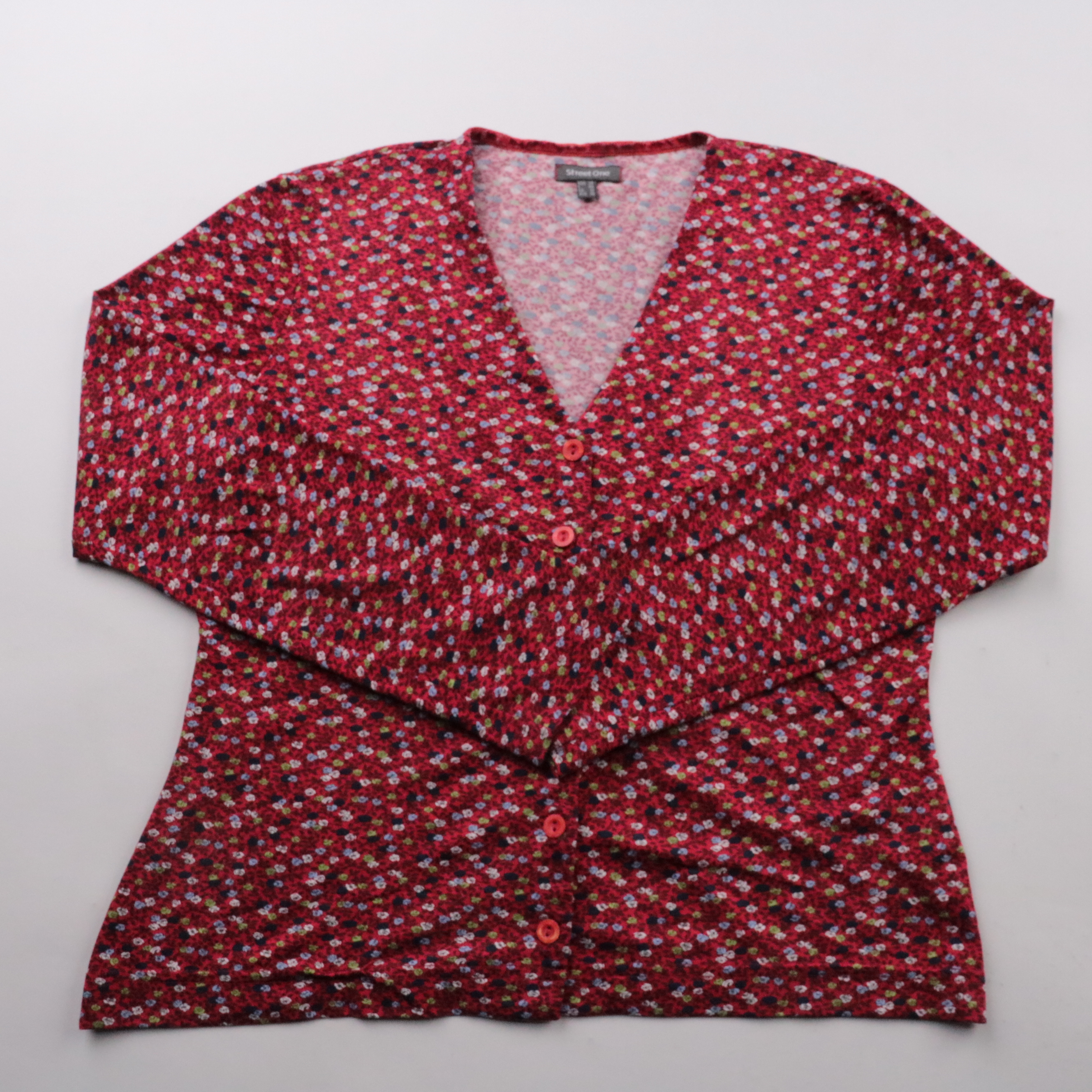 Блузка Street One красного цвета с мелким цветочным принтом и V‑образным вырезом на пуговицах. Подойдёт для повседневных образов и офиса в сочетании с джинсами или юбкой. Трикотаж с эластаном хорошо тянется и комфортно садится по фигуре.