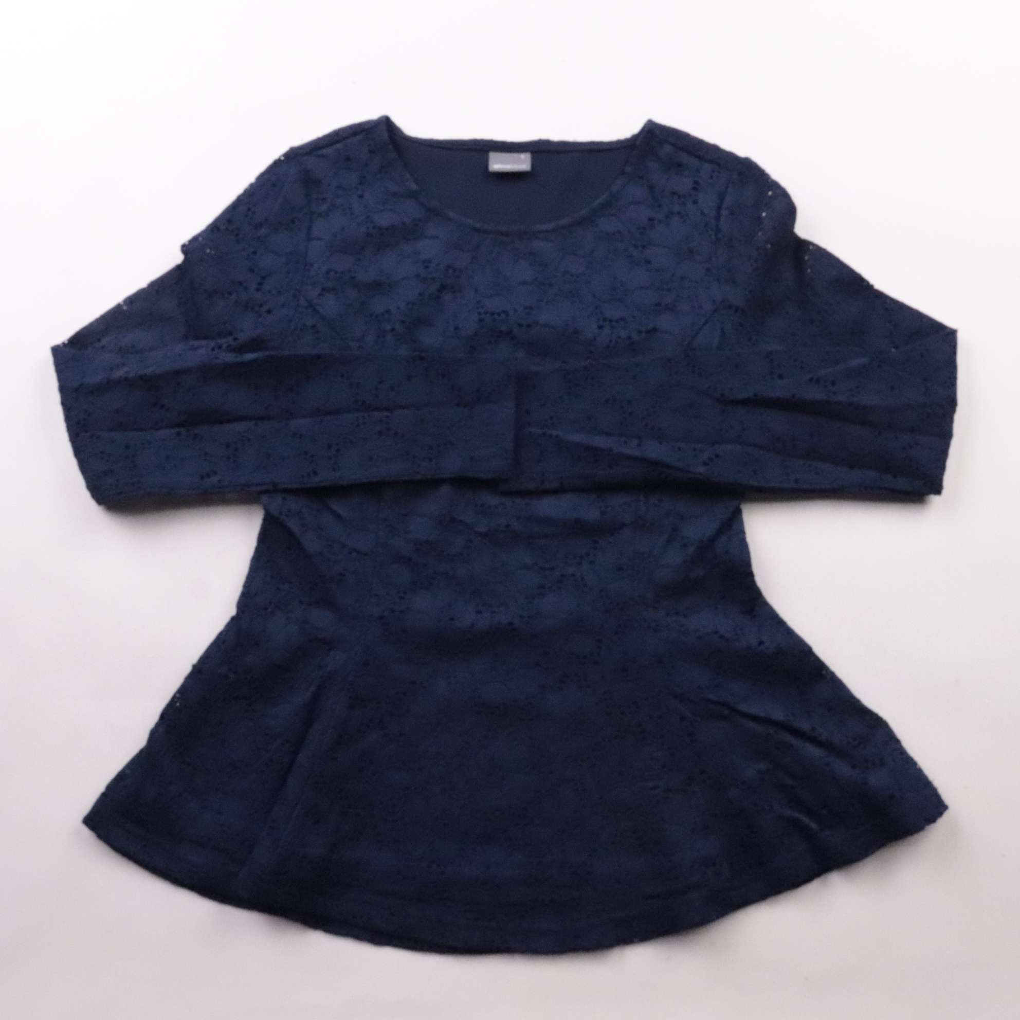 Тёмно-синяя блузка Gina Tricot из фактурной ткани с перфорацией и коротким рукавом. Подойдёт для офиса и повседневных образов, хорошо сочетается с юбкой или джинсами. Материал эластичный и комфортно садится по фигуре.