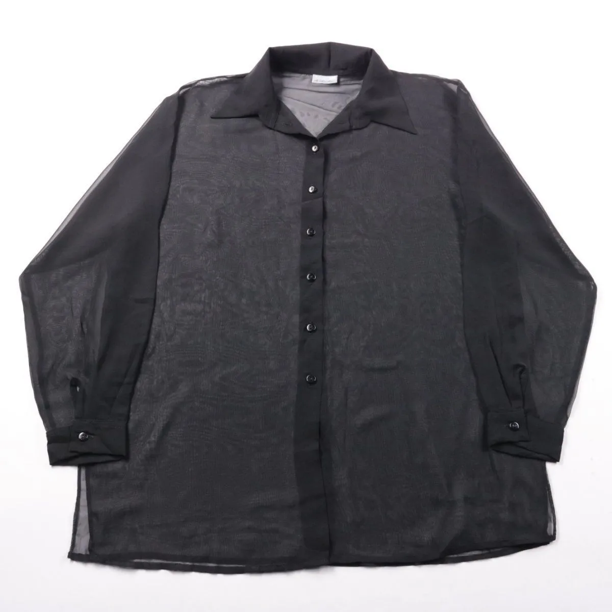 Полупрозрачная чёрная блузка Suisses на пуговицах с отложным воротником и длинными рукавами. Подойдёт для вечерних выходов и для офисных образов с топом или майкой под низ. Лёгкая ткань почти не мнётся и комфортно ощущается на коже.