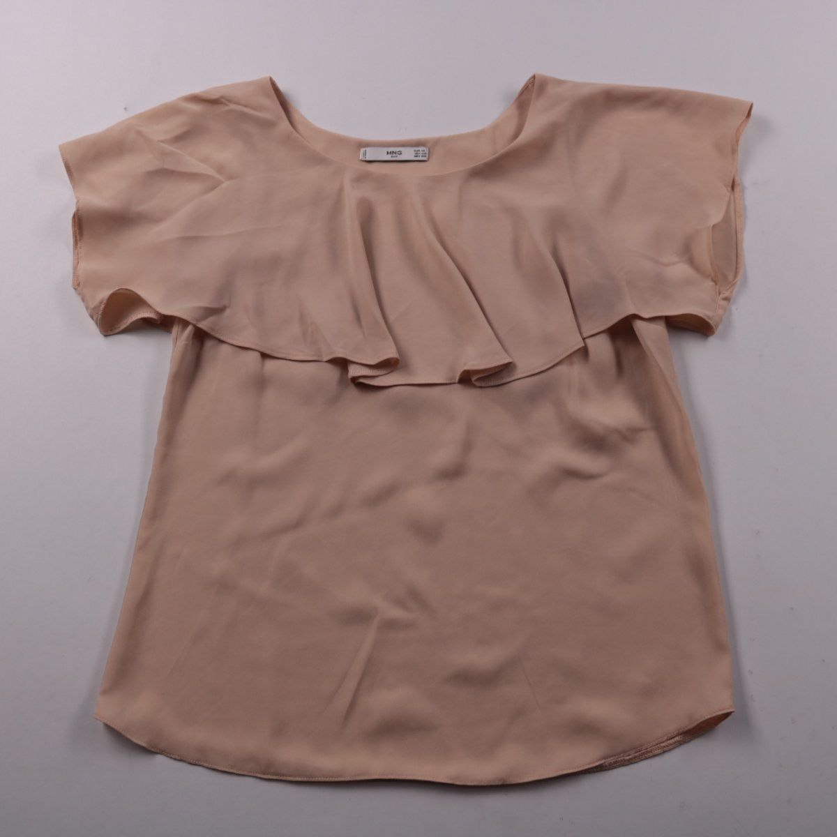 Женская блузка Mango нежного бежевого оттенка с коротким рукавом и верхней оборкой-воланом. Подойдёт для офиса и повседневных образов с брюками или юбкой, когда хочется более мягкий и аккуратный верх. Лёгкая ткань хорошо драпируется и комфортно носится в течение дня.