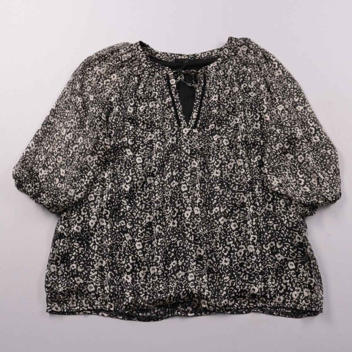 Блузка LolaLiza с мелким цветочным принтом и завязкой у горловины, рукава короткие с объёмом. Подойдёт для повседневных образов и офиса в тёплую погоду, хорошо сочетается с джинсами и юбками. Материал из полиэстера практичный в уходе и почти не мнётся.
