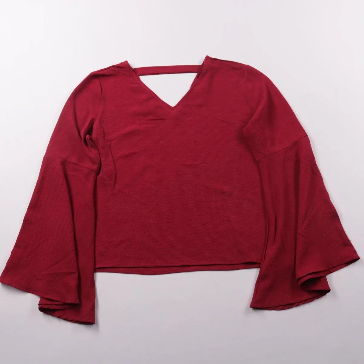 Женская блузка с V-образным вырезом и декоративной перемычкой на спинке, с длинными расклешёнными рукавами. Подойдёт для повседневных и вечерних образов с брюками или юбкой. Лёгкий полиэстер почти не мнётся и быстро сохнет.