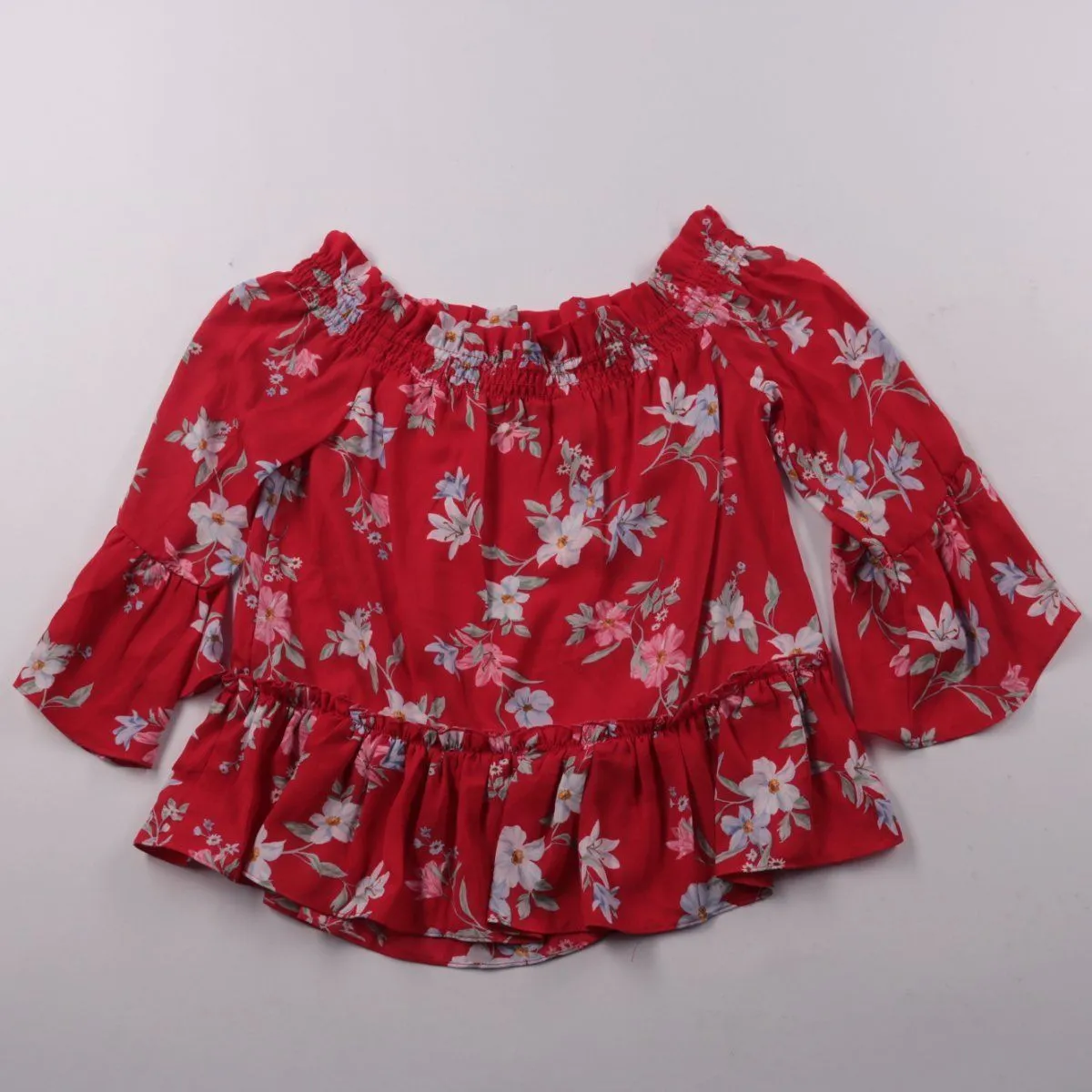 Женская блузка H&M с цветочным принтом на красном фоне, с открытыми плечами и эластичной сборкой по горловине. Подойдёт для лета и отдыха, хорошо сочетается с джинсами и юбками. Практичный плюс — лёгкая ткань и эластичный верх, который удобно держится и не сковывает движения.
