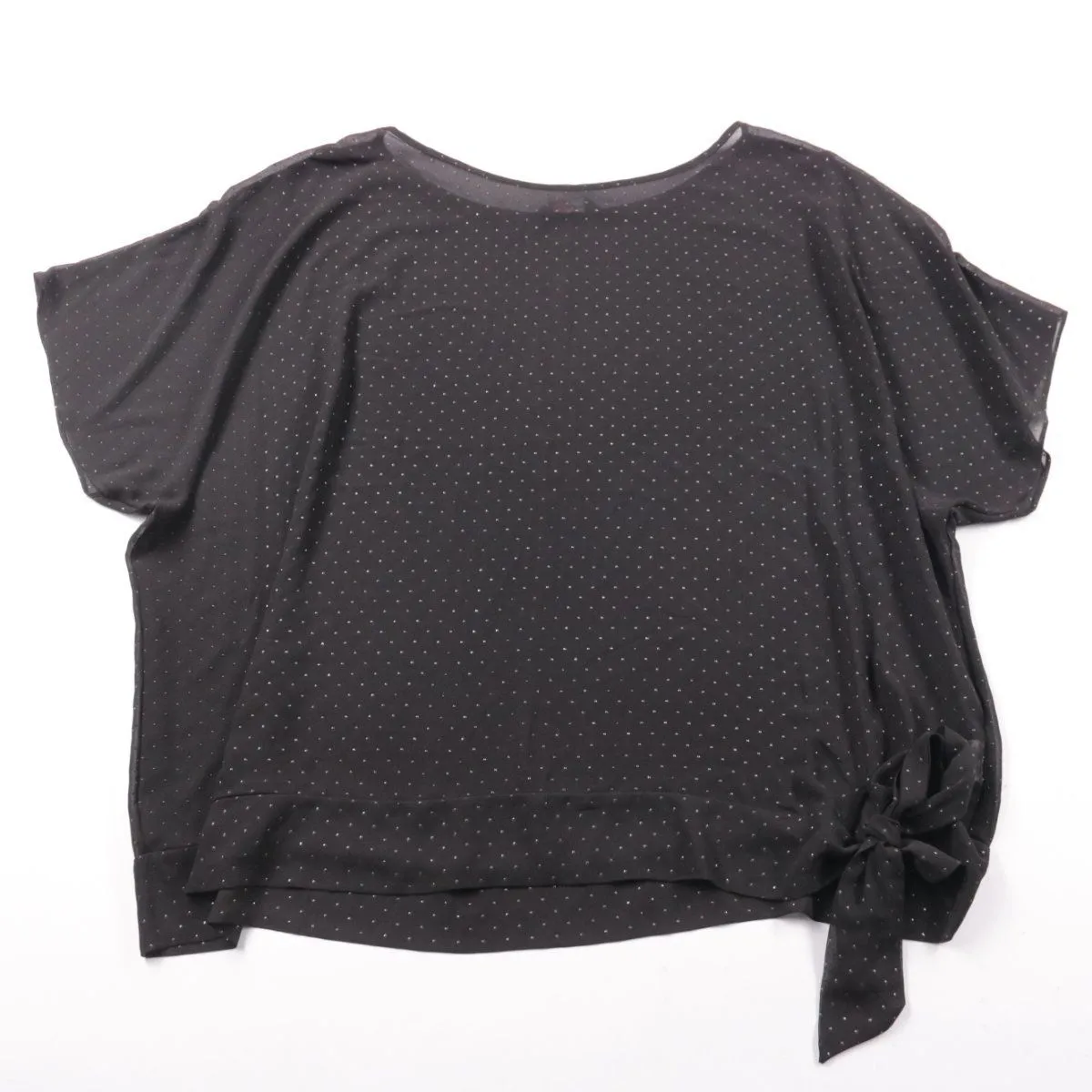 Женская блузка Yours чёрного цвета в мелкий горох, свободного кроя с коротким рукавом и завязкой сбоку. Подойдёт для повседневных образов и офиса с однотонными брюками или юбкой. Свободная посадка не стесняет движений и удобно садится по фигуре.