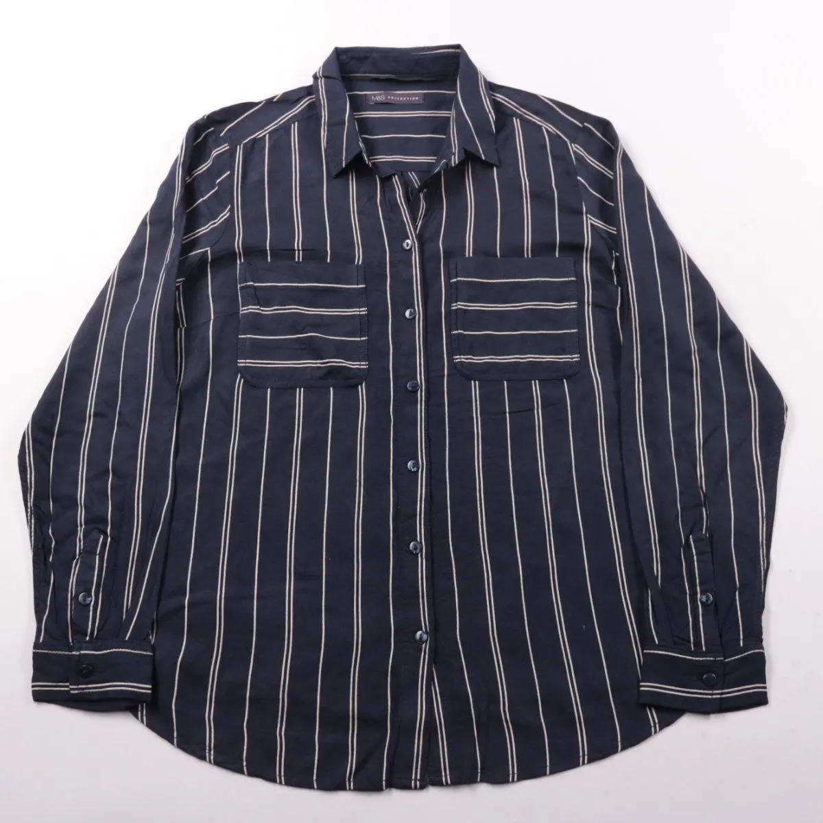 Женская рубашка M&S из 100% вискозы в тёмно-синюю полоску, с отложным воротником и двумя накладными карманами на груди. Подойдёт для офиса и повседневных образов, хорошо сочетается с джинсами и брюками. Вискоза мягкая и дышащая, комфортна в течение дня.