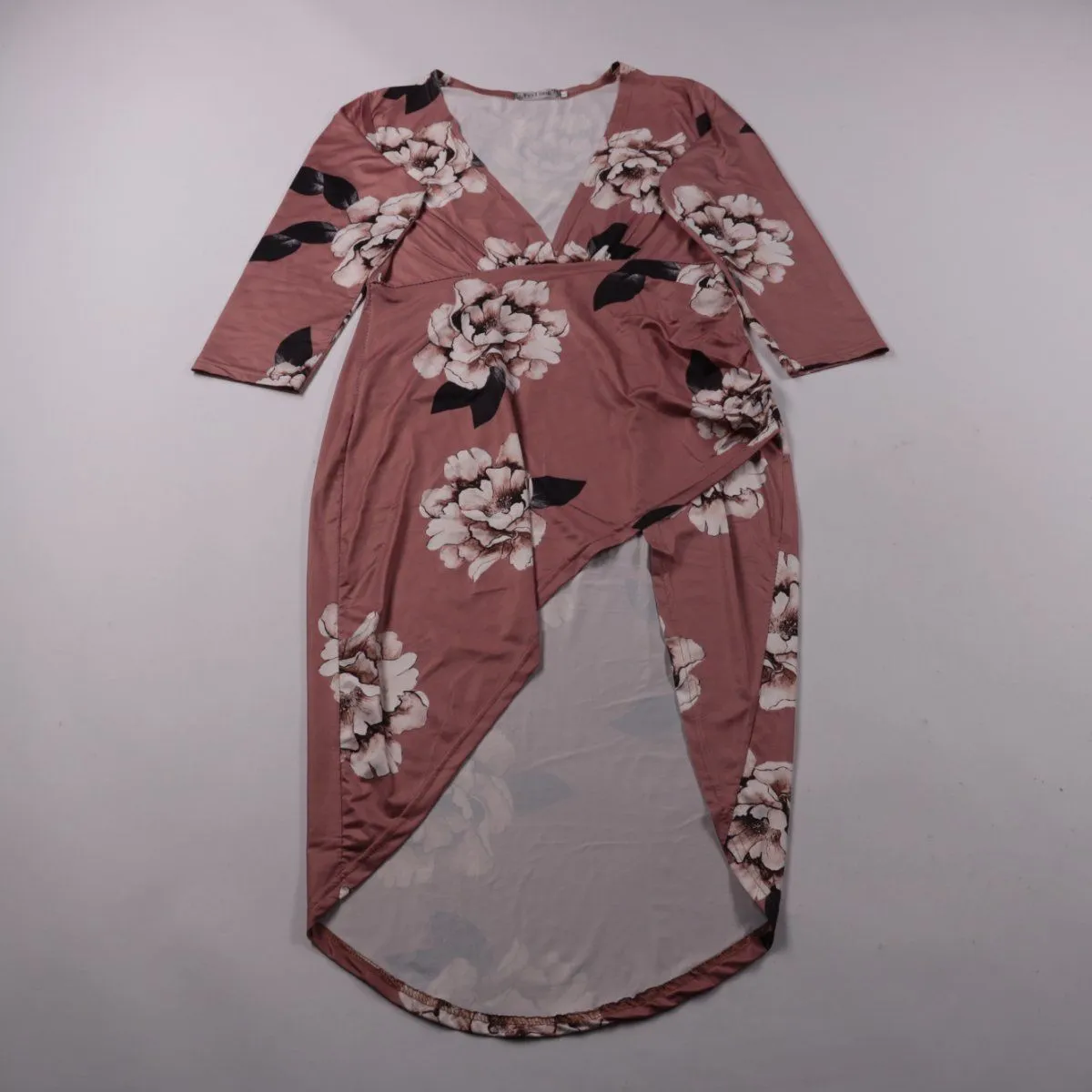 Повседневное платье FeiTong с цветочным принтом и V-образным запахом, рукава 3/4. Подойдёт для прогулок и повседневных выходов, асимметричный подол добавляет акцент в образ. Практичный плюс — мягкая тянущаяся ткань комфортно садится по фигуре.