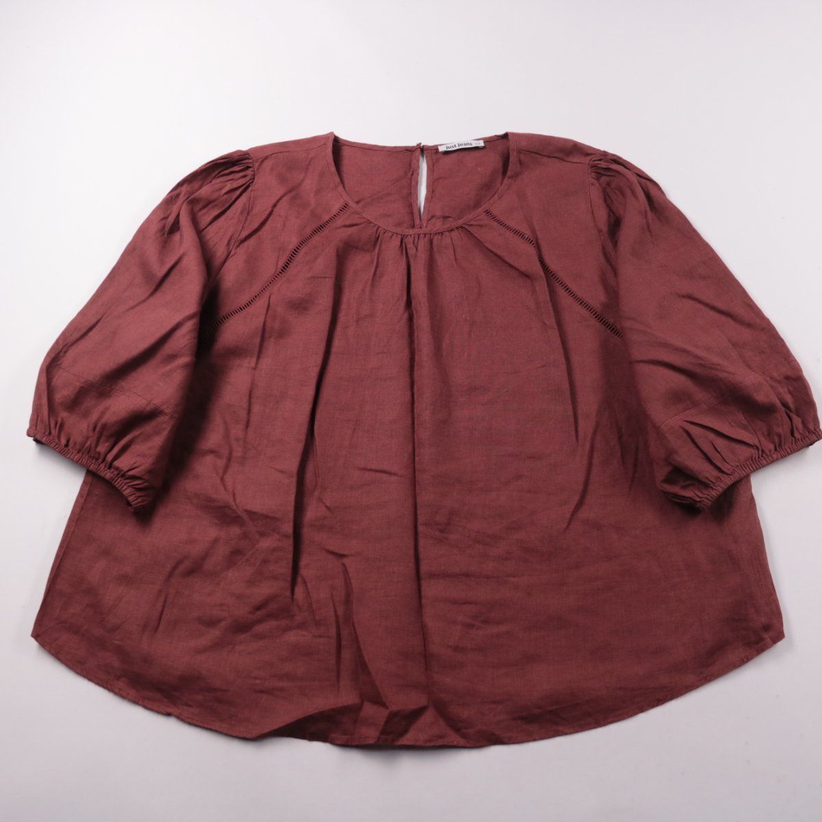 Блузка Just Jeans бордового цвета из льна с объёмными рукавами и сборкой у горловины. Подойдёт для летних прогулок и повседневных образов, хорошо сочетается с джинсами и юбками. Лён дышит и комфортен в жаркую погоду.