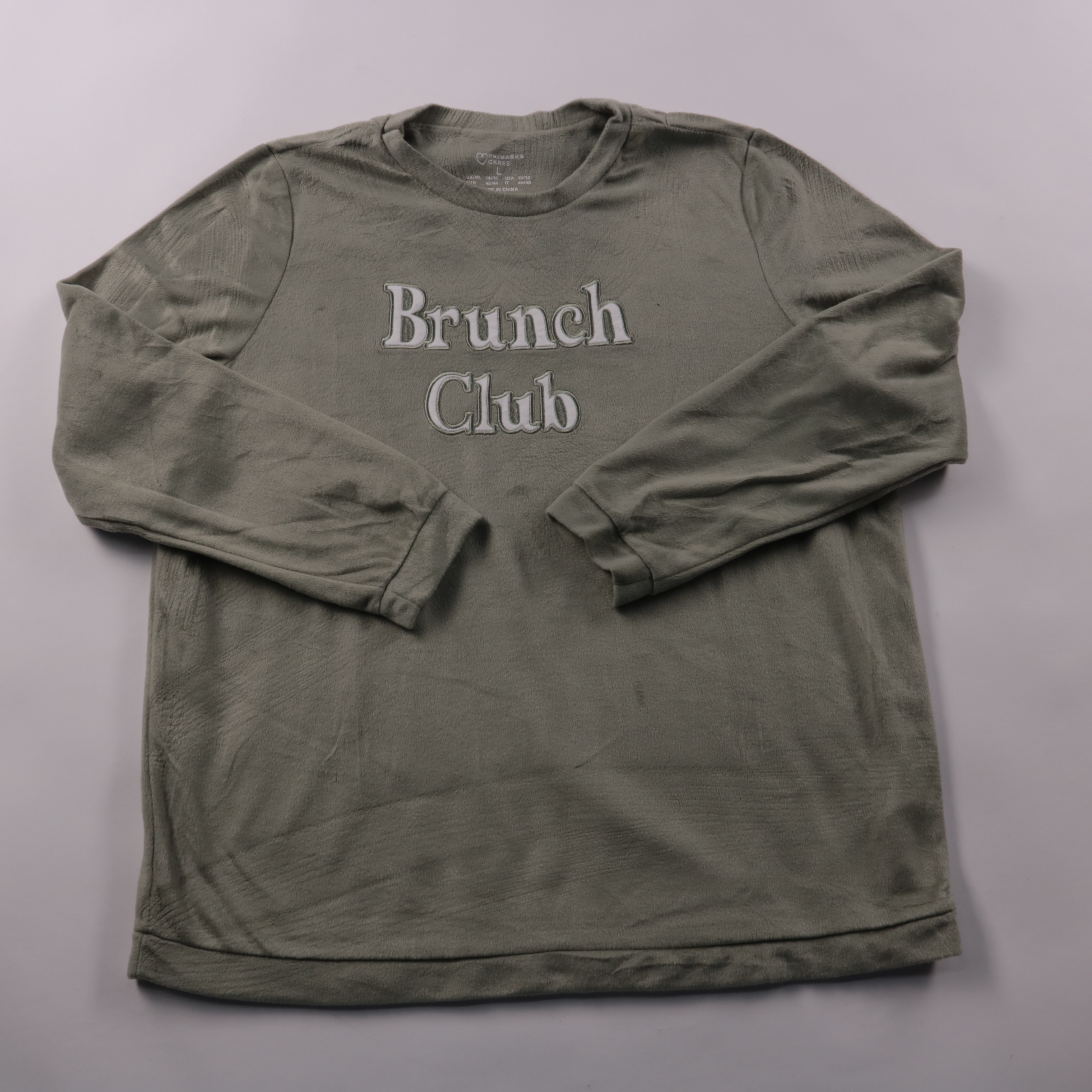 Свитшот Primark цвета хаки с вышитой надписью Brunch Club и круглым вырезом. Подойдёт для повседневных образов и домашнего отдыха в прохладную погоду. Мягкий флисовый материал хорошо сохраняет тепло и прост в уходе.