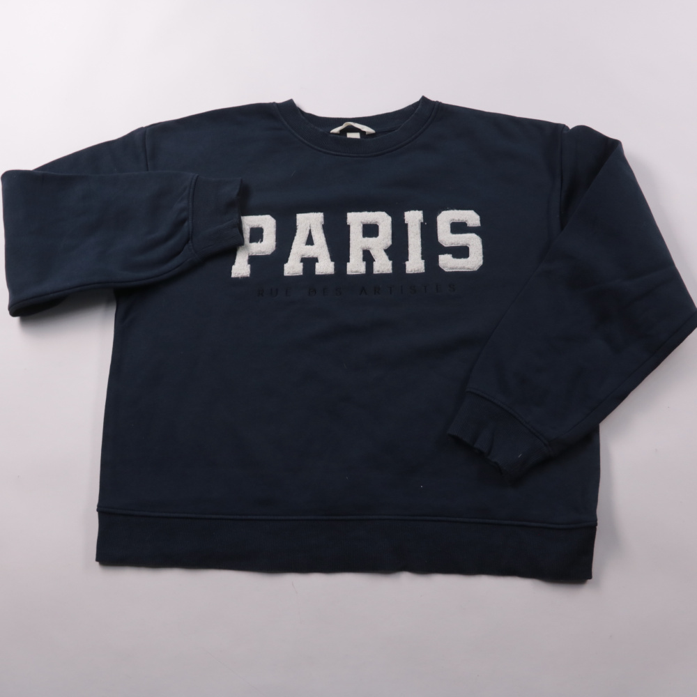 Свитшот H&M темно-синего цвета с крупной надписью PARIS спереди. Подойдет для повседневных образов в прохладную погоду и комфортно сочетается с джинсами или спортивными брюками. Мягкий хлопковый материал приятен к телу и прост в уходе.