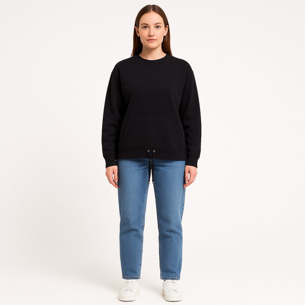 Женский свитшот F&F чёрного цвета с круглым вырезом и карманом-кенгуру. Подойдёт для повседневных образов и прогулок в прохладную погоду, хорошо сочетается с джинсами и кроссовками. Мягкий футер помогает сохранять тепло и комфортно носится весь день.