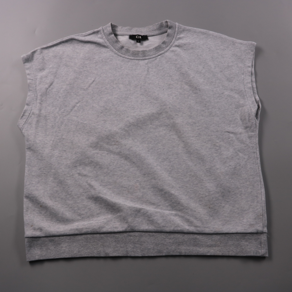 Серый свитшот C&A без рукавов, базовый и удобный для повседневных образов. Подойдёт для прогулок и дома, легко сочетается с джинсами и спортивными брюками. Трикотаж с высоким содержанием хлопка приятен к телу и прост в уходе.