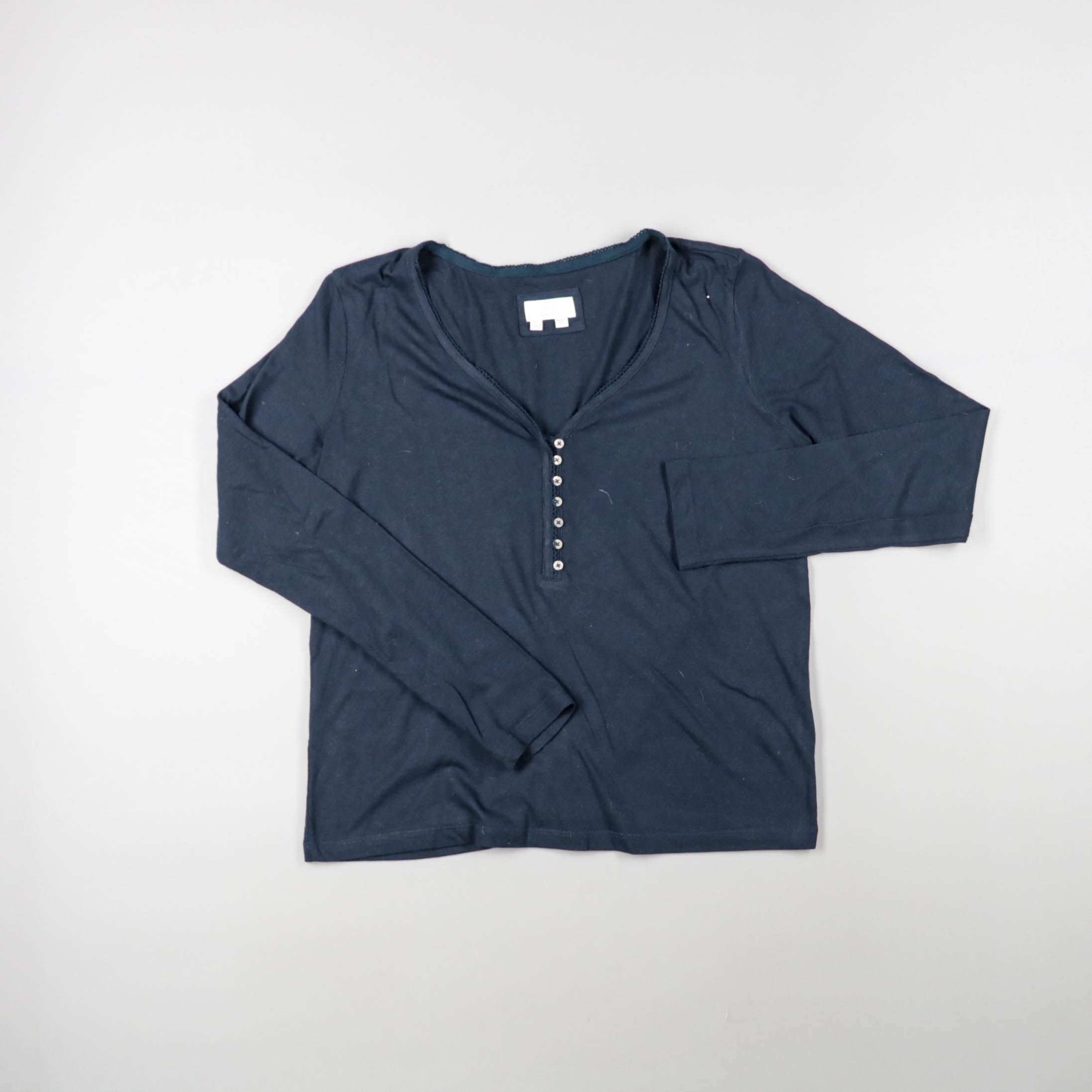 Тёмно-синий лонгслив с V-образным вырезом и планкой на пуговицах. Подойдёт для повседневных образов и как базовый слой в прохладную погоду. Мягкий трикотаж тянется и комфортно садится по фигуре.