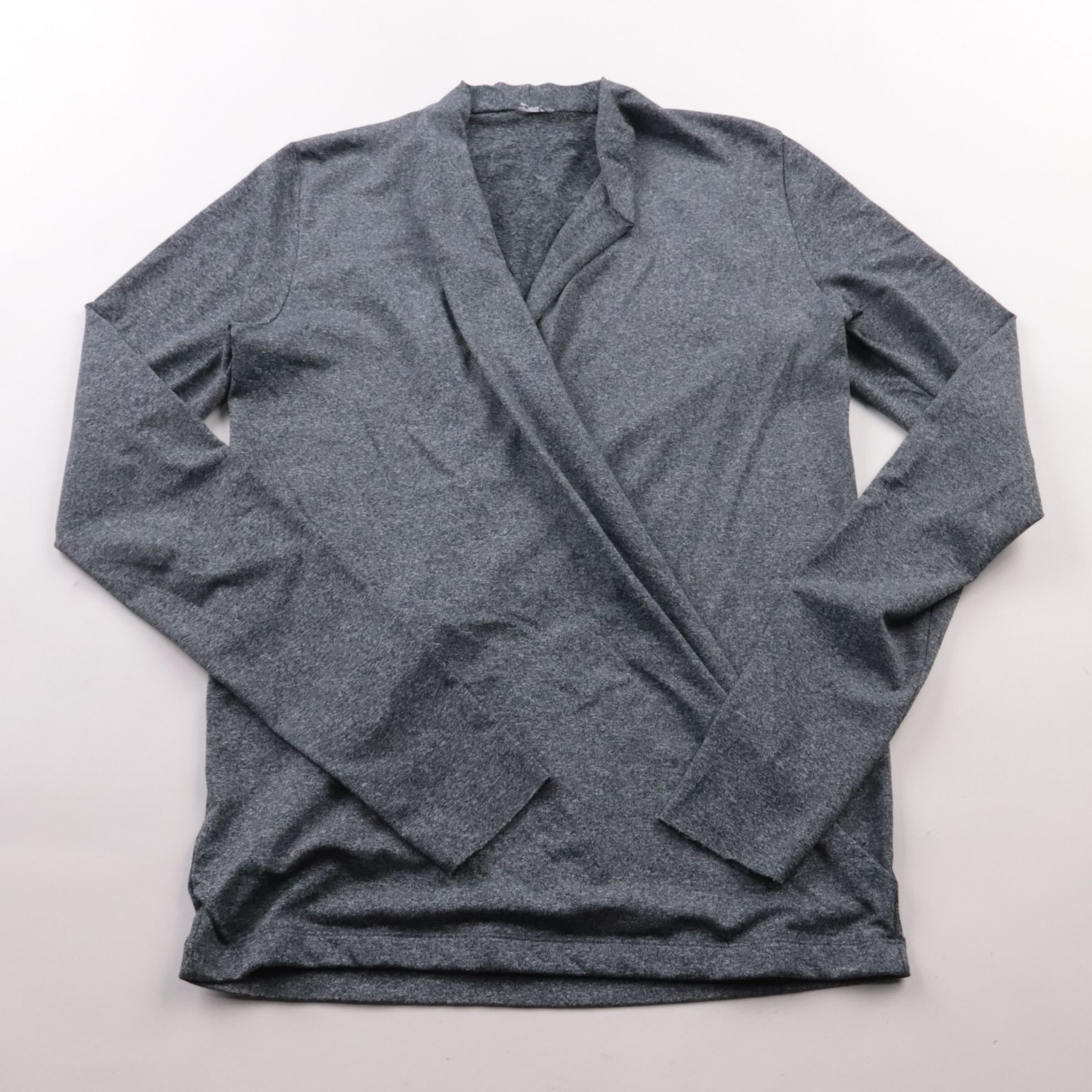 Серый меланжевый лонгслив Harper & Yve с запахом и V-образным вырезом. Подойдёт для повседневных образов и офиса с брюками или юбкой. Эластичная ткань хорошо тянется и комфортно садится по фигуре.