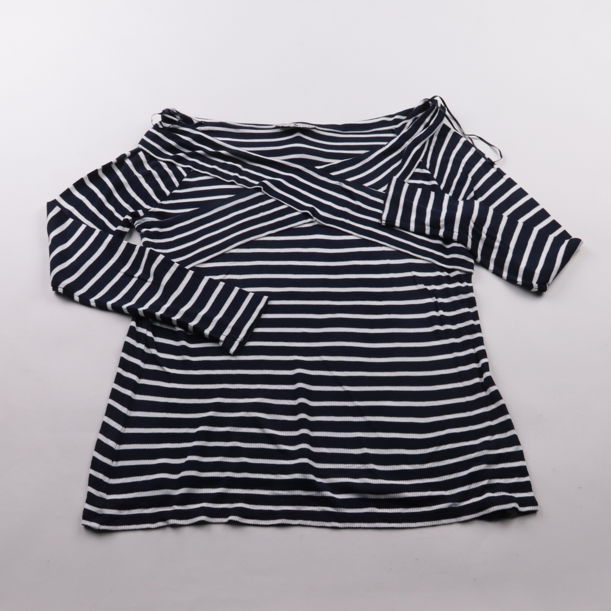 Женский лонгслив Tu в темно-синюю полоску с оригинальным перекрёстным вырезом спереди. Подойдёт для повседневных образов с джинсами или юбкой в прохладную погоду. Трикотаж с эластаном хорошо тянется и комфортно садится по фигуре.
