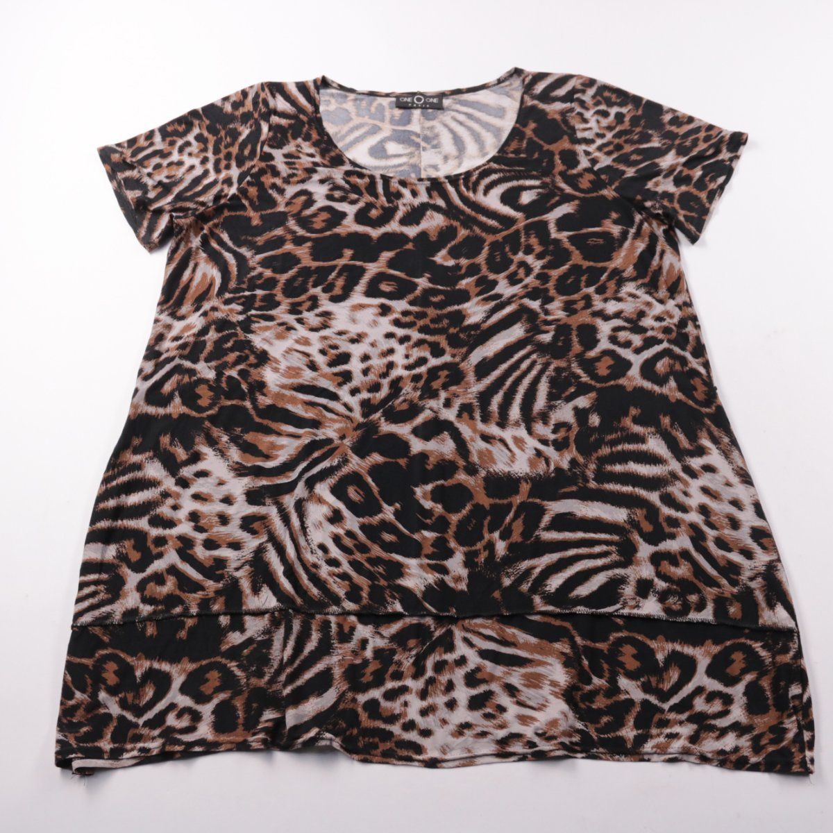 Женская футболка One One Paris с коротким рукавом и округлым вырезом, выполнена из тонкого трикотажа с анималистичным принтом. Подойдёт для повседневных образов и поездок, легко сочетается с однотонным низом. Материал мягкий и эластичный, удобно сидит и не стесняет движений.