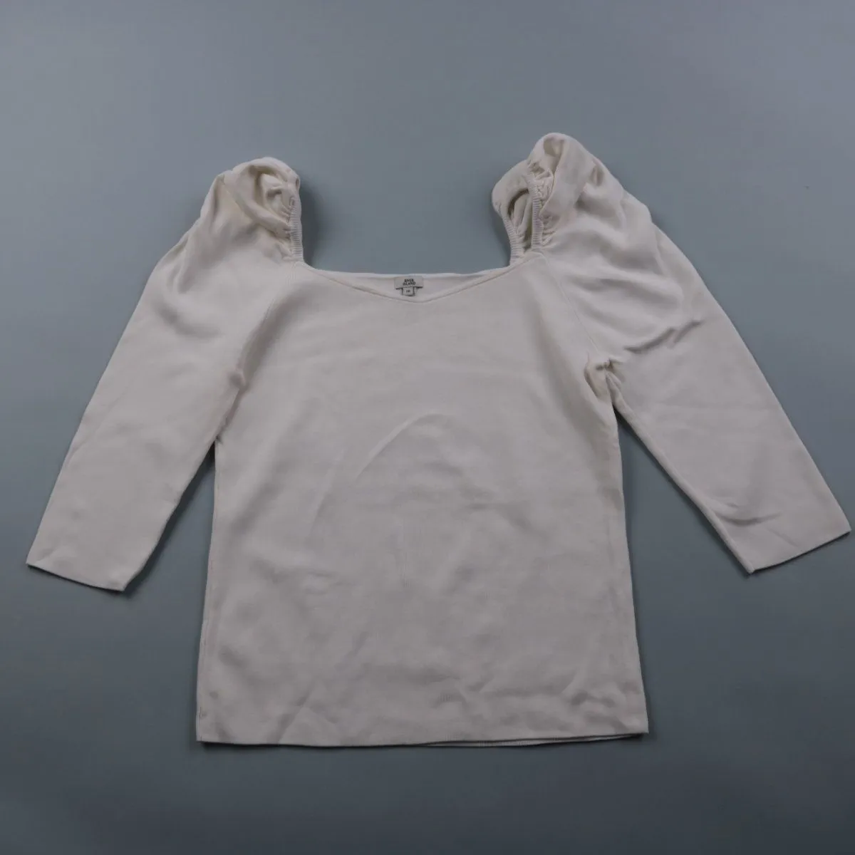 Белый лонгслив River Island из мягкого трикотажа с квадратным вырезом и рукавами-фонариками. Подойдёт для повседневных образов и как базовый верх под жакет или кардиган. Практичен тем, что хорошо тянется и легко сочетается с разной одеждой.