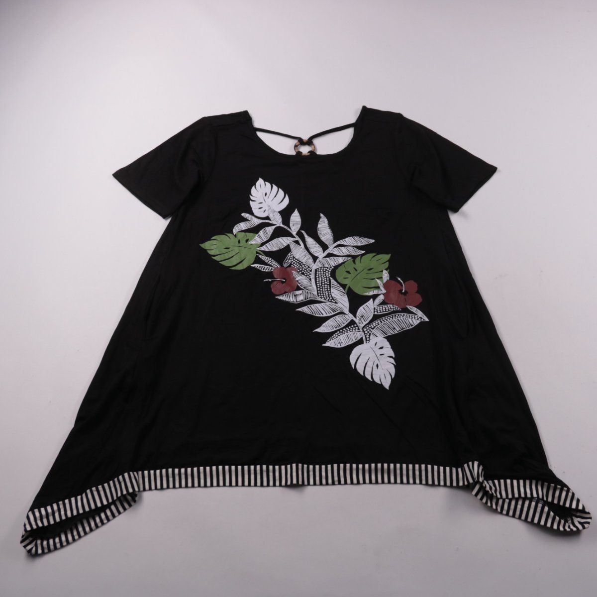 Женский топ ZimeZoe свободного кроя чёрного цвета с крупным растительным принтом и контрастной полосатой отделкой по низу. Подойдёт для повседневных летних образов, а также для отдыха благодаря лёгкой посадке. Вискоза с добавлением эластана приятна к телу и немного тянется, поэтому вещь комфортно сидит.