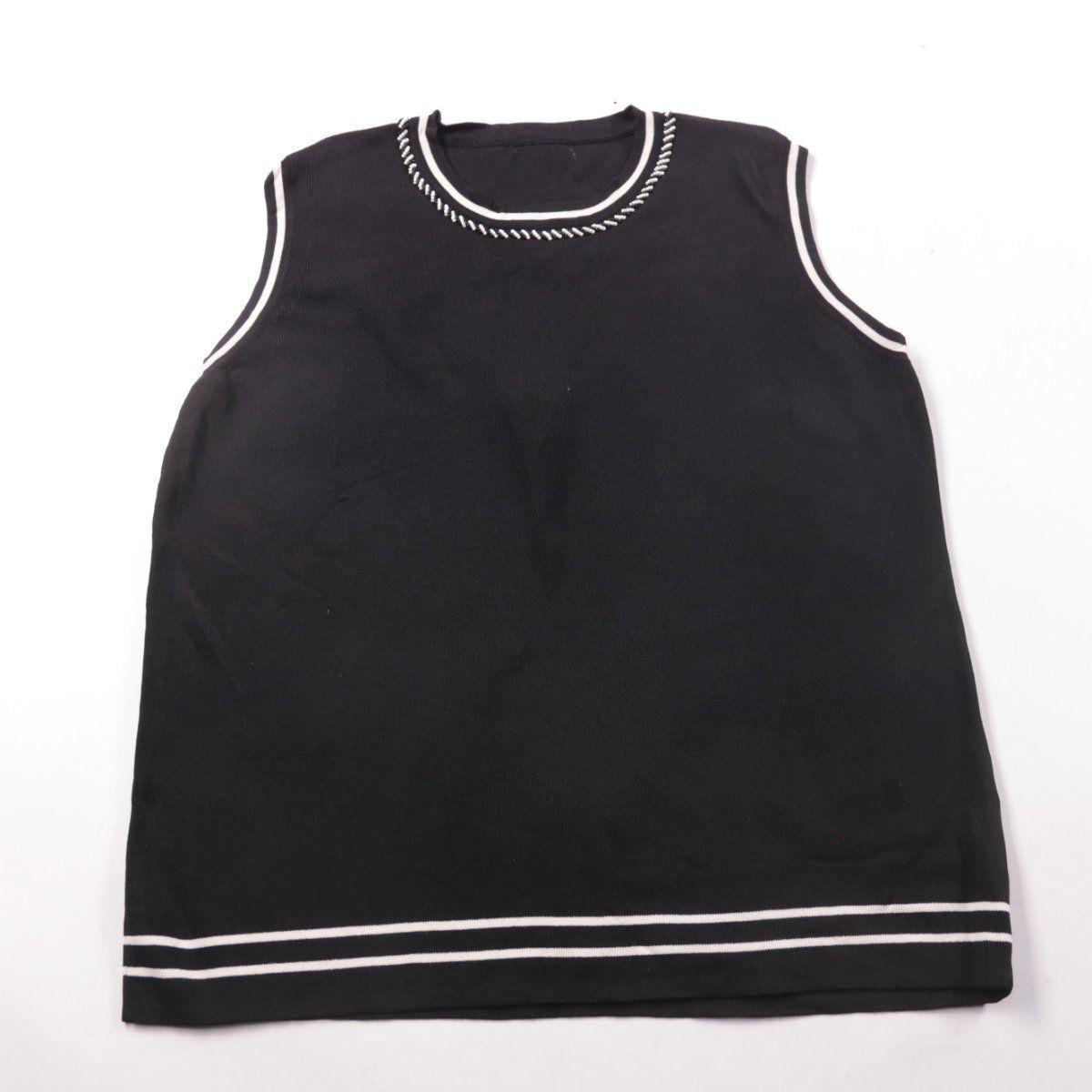 Черный женский топ без рукавов с белой окантовкой по горловине, проймам и низу. Подойдет для повседневных образов и многослойных комплектов в теплое время или под жакет. Практичное преимущество — легко сочетается с базовыми вещами и не требует сложного ухода.