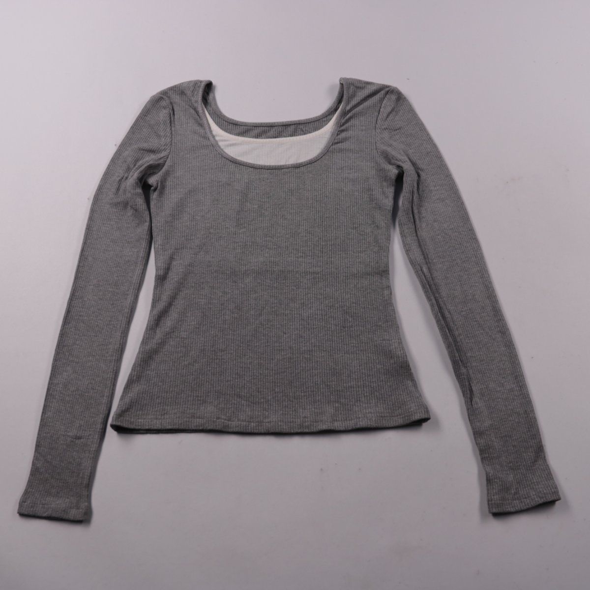 Женский лонгслив в сером цвете из трикотажа в рубчик, без указания бренда. Квадратный вырез и приталенный силуэт подойдут для повседневной носки и многослойных образов. Материал тянется и удобно садится по фигуре.